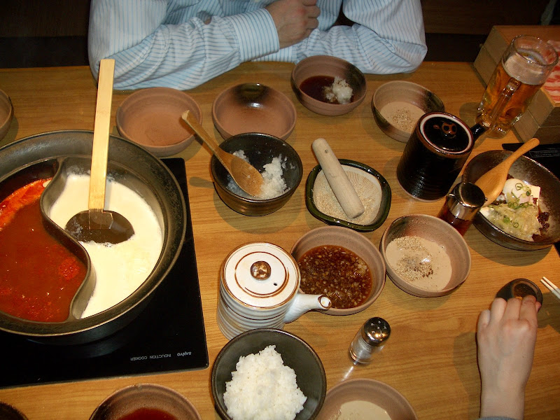 Prea multe despre „buctătăria” japoneză nu ştiam, de fapt nu ştiam nimic în afară de sushi. Ei bine, mulţumită lui C. (rămânem datori) am descoperit o grămadă de feluri de mâncare care mai de care mai spectaculoase, elaborate şi gustoase. Nu ştiu dacă aşa a gândit-o C., dar mâncărurile au crescut în complexitate şi spectaculozitate pe zi ce trecea. După simpla soba din prima zi, care a fost oricum interesantă, apoi sushi-ul de la el, azi a fost rândul shabu-shabului. Care este aşa: o oală împărţită în 2 compartimente, în care snt 2 zeme diferite, unul alb de soia, celălalt roşu de… nu ştiu ce, curry, cred, care oală se pune pe o plită, să fiarbă lichidele. În boluri separate primeşti tot felul de alte sosuri şi mirodenii (din nou alb şi roşu de bază, plus alte culori), cu salăţi, legume şi, desigur, orez.