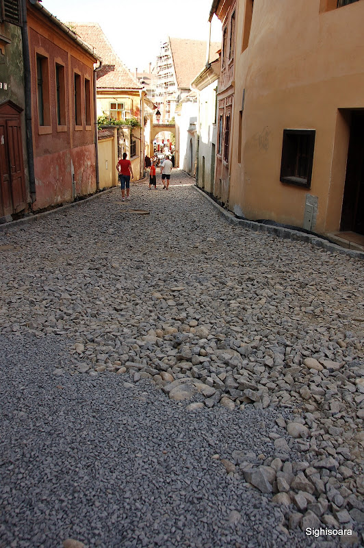 Un cuvânt despre pavaj. Cetatea e întoarsă cu fundun sus de câţiva ani, pe motiv de ceartă de discordie în ce priveşte pavajul care trebuie pus după ce au desfundat-o total pentru gaze, canalizare, apă, gaze, canalizare, şi tot aşa. O tabără vrea piatră de râu, cum era originalul, altă tabără piatră cubică. Interese mafiote, probabil, care nu se împacă, aşa că cetatea e într-un hal fără de hal.