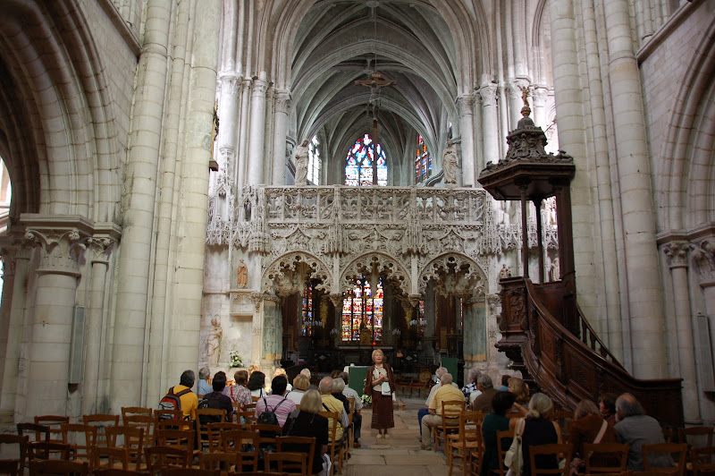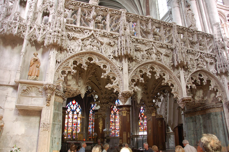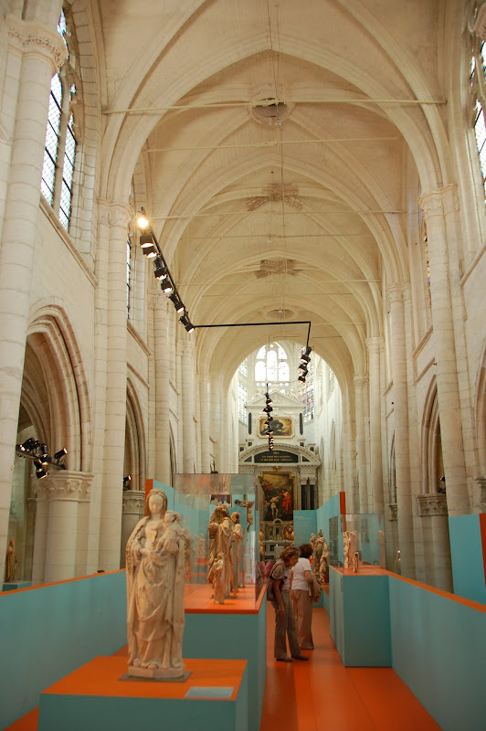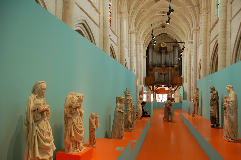 Nu înainte de a intra în biserica din piaţa centrală, să văd cum e pe dinăuntru. Cum intru – văd că e o expoziţie, 2 domnişoare la intrare. Întreb ca să mă aflu în treabă cât costă, nu prea aveam chef să intru. Zice „6 euro, dar e gratis pentru studenţi, pensionari şi… (se mai uită pe nişte hârtii) şomeri.” „Ăăă”, zic, „să văd dacă am carnetul de student la mine”, şi mă caut în portofel – ştiam că nu-l am. „Nu-l am”, zic, cu părere de rău – aveam o ciudată senzaţie că fata ar prefera să dea bilet gratis. Nu ştiu cum m-am mişcat între timp şi am dat cu ochelarii de pământ, de le-a sărit o lentilă (rama era spartă deja). Zic „şit”. Zice „sper că nu s-au spart”. Îi arăt rama fără lentilă, zmbind în tăcere. Zice „vă fac bilet gratuit, poftiţi.” Aş fi plătit, eram cu bancnota în mână, dar am mulţumit frumos şi-am băgat-o la loc. Aşa am intrat la neobişnuita expoziţie de sculptură din biserica din Troyes.