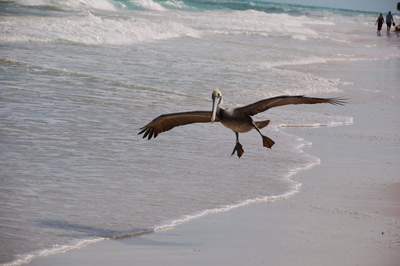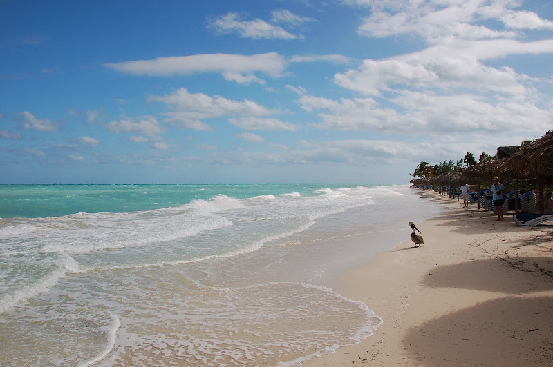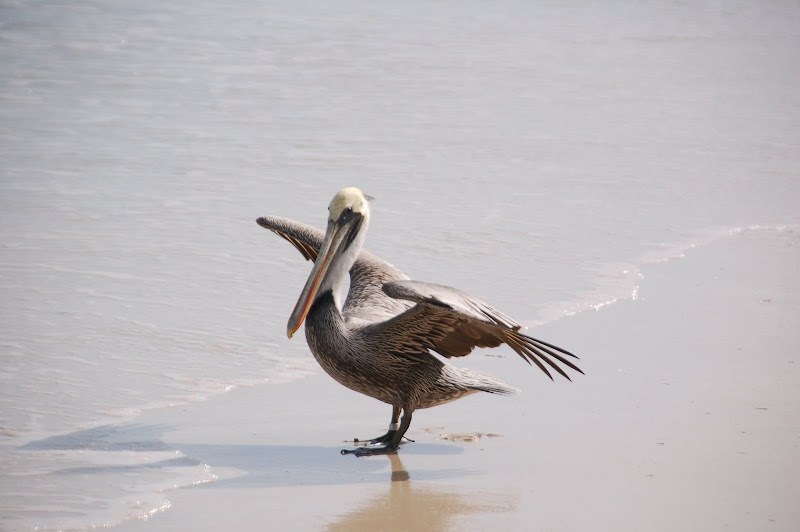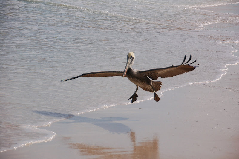 Când colo – surpriză! – plaja dispăruse. O furase marea. Nu ştiu dacă era doar flux, ci era şi vremea de vină – înnorat şi foarte vântos. Apa ajungea până foarte aproape de umbrelele de plajă, şezloangele erau strânse în spatele lor. Pe fâşia aia îngustă am fugit, mai pe uscat, mai prin apă. La un moment dat am ajuns la o îngustare unde se putea doar prin apă, şi dă-i, până la capătul plajei. De fapt la curbă, că mergea şi mai încolo, dar nu mai era amenajat nimic. Frumos, şi obositor. Acolo la „cap” am văzut pelicanul la vânătoare, de fapt pescuit – unul singur, dădea rotocoale şi apoi plonja cu graţie, întinzându-se săgeată la contactul cu apa – foarte fain, ca la discovery. Habar n-aveam atunci că pelicanolul era angajatul hotelului. Pentru că…