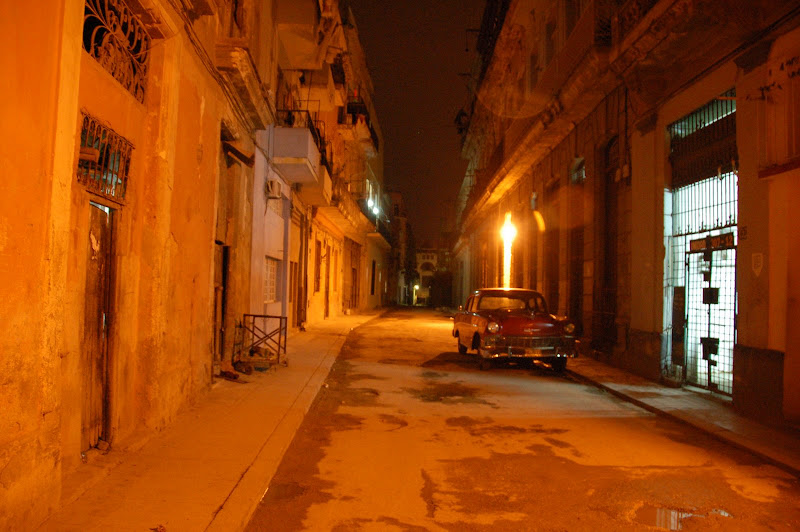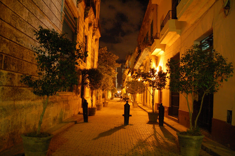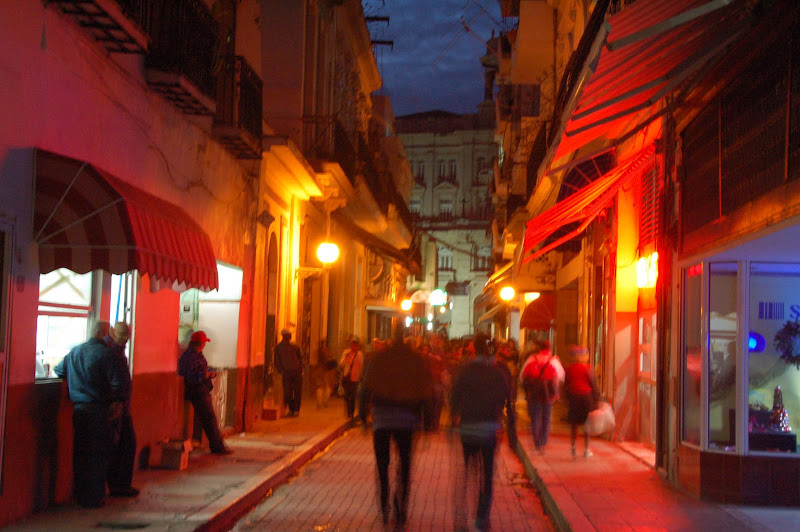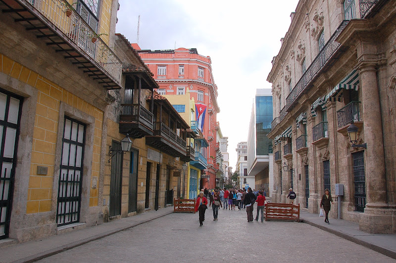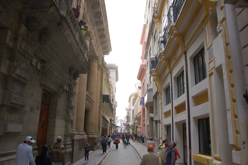 Mergând fără ţintă (de fapt, cu ţintă, căutând un bancomat) am ajuns pe bulevardul Obispo, un fel de 5th avenue al Havanei, plin de turişti străini, dar şi de localnici. Totul pe muzica răsunând de la diverse taverne. De pe el snt majoritatea imaginilor renovate de mai sus, iar atmosfera „live” arată aşa: