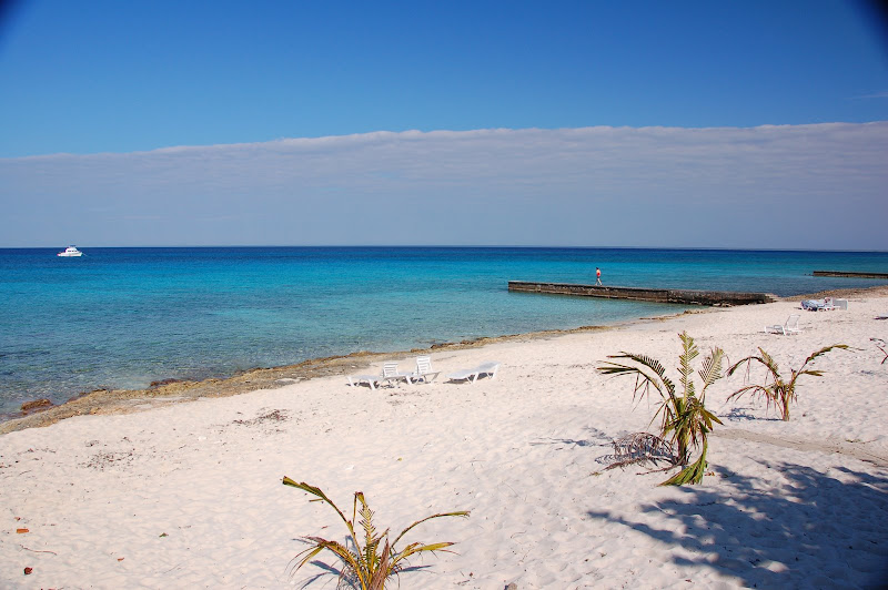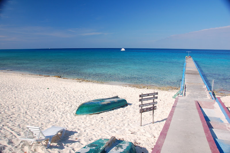 Între timp eu întrebasem la recepţie care e treaba cu scufundacii fără patalama (mi-era ciudă că uitasem, în ziua plecării, să cer o patalama de la Cayo Coco cum că făcusem cursul de iniţiere). Le-am zis oamenilor aici că n-am, dar am făcut cursul. Zice – dacă vrei, poţi să te scufunzi cu un instructor, doar aici la mal. Vrei? …vreau. Cu un pic de emoţie, desigur, da’ am zis hai s-o facem şi pe asta. A. zisese că era vizibilitate foarte bună, aşa că – m-am dus pe acelaşi ponton de unde plecase A., am intrat pe barcă şi… ne-am scufundat de acolo. Eu şi un cuplu de pe plajă, pe care după ce i-am auzit vorbind pe barcă i-am întrebat sfătos, făcând pe deşteptu’: „Din ce parte a Suediei snteţi?”. „Din Norvegia”. Aha, am înghiţit în sec. Norvegienii nu-i prea au la inimă pe suedezi, din câte ştiu. Eh, să fie sănătoşi. Fata nu se mai scufundase niciodată, aşa că m-am mai liniştit. Nu de tot, că mă întrebam cât de adânc o să mergem, cum o să se comporte urechile… s-au comportat bine. Am coborât mai adânc decât data trecută, le-am „suflat” de câteva ori, mi-am suflat masca de câteva ori, la început convulsiv, apoi tot mai calm, şi am dat o tură cu toţii. Fain, vizibilitate parcă un pic mai bună decât la Cayo Coco, din nou toţi prietenii lui Nemo, în afară de Nemo, corali, frumos. Languste n-am văzut, deşi pe acolo cică le văzuse A. Am văzut peşti din ăia care stau pe fundul apei şi se uită cu privire tâmpă în sus, bancuri mici (vreo 20-30) care stăteau înghesuiţi unul în celălalt, nemişcaţi, şi se uitau la mine, peşti foarte mici şi foarte coloraţi, de la albastru închis puternic până la portocaliu contrastant (era unu’ chiar jum’atea din faţă portocaliu, cea din spate închisă la culoare, foarte nostim). Ca-n acvariu. (ce afirmaţie tristă… dar aşa e când eşti city slicker, de ce să ne ascundem după deşt).
