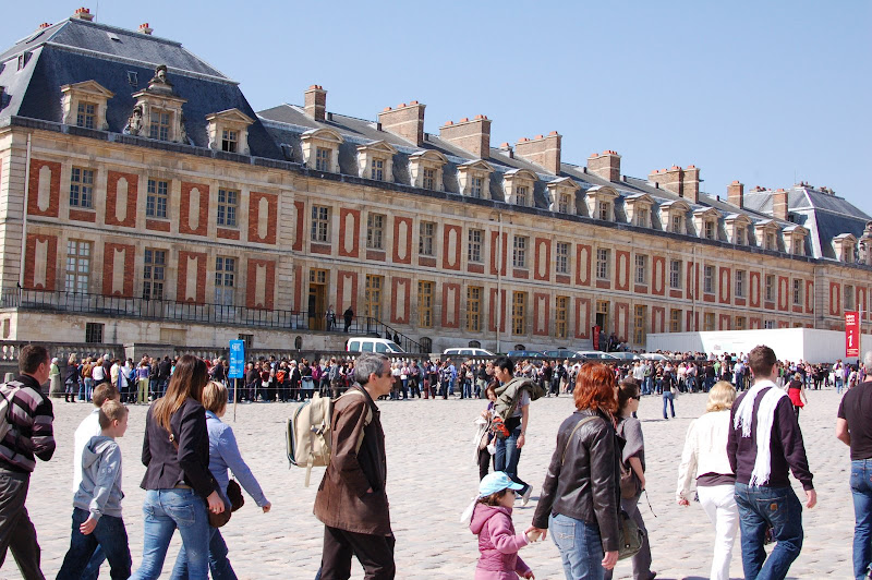 Versailles era pe lista de „trebuie văzut”, că prea mult am citit în copilărie despre muşchetari, măşti de fier şi alte aventuri. La Versailles se ajunge cu trenul de la Paris, durează vreo juma’ de oră. Chiar în gară era o domnişoară care anunţa că se pot lua bilete şi de aici, să nu stai la coadă la castel. Am stat aşadar aici la coadă, să fi durat vreo 10 minute, şi am luat bilete. Vrusesem să fac rezervare în avans pe internet, dar am lăsat de pe-o zi pe alta şi n-am făcut.