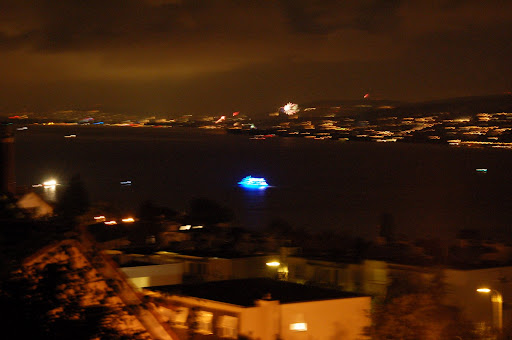 Artificiile se termină repede, şi aşteptând în frig îmi petrec vremea pozând ce se vedea din lac, cu focuri de artificii puşcând izolat din grădini. Se vedea frumos, dar pozele n-au ieşit. Aşa, ca idee, asta unde se vede şi vaporul de croazieră, probabil şi el în căutarea celor mai spectaculoase artifoci.