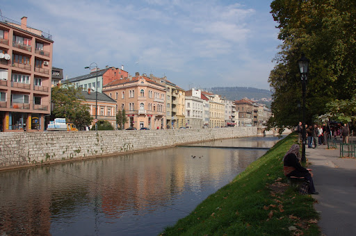 dar dat fiind că mai sunt câteva minute mai zăbovesc aici lângă pod, clădirile se reflectă frumos în apa râului Miljacka, în ambele direcţii.