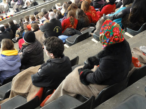 Fusesem avertizat de telespectatori de acasă că în sală e un frig de crapă ghetele, și într-adevăr, nu se simte mare diferență față de afară, parcă e chiar mai frig. Lumea se înfofolește cu păturile maro primite de la organizatori, și cu ce batic a mai găsit pe-acasă.