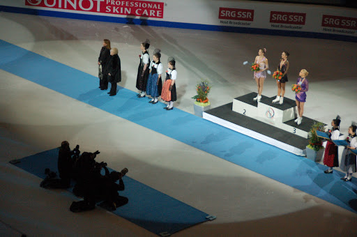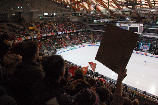S-a anunţat o concurentă din Elveţia. Nu poate fi Sarah Meier, că ea e pe locul 3 după programul scurt, după cum aflasem de pe site, trebuie să fie alta. E Romy Bühler, şi mă hotărăsc brusc că ea va fi exemplul filmat pentru acest reportaj. Până să scot aparatul cel mic, a şi început, dar n-am pierdut mare lucru. Iată cum s-a văzut un exerciţiu de patinaj de la cucurigu, de unde stăteam eu, urmată de secvenţe cu ce se întâmplă prin sală în timpul în care nu se văd imagini la televizor: