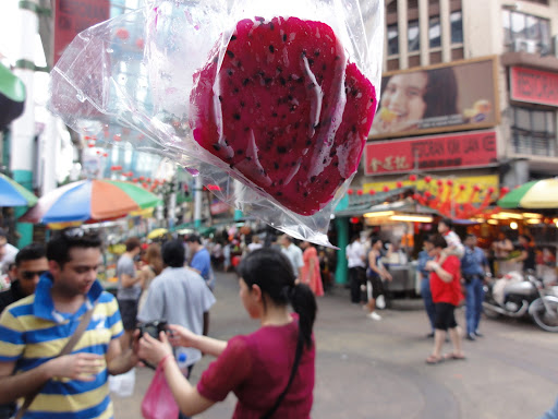 Din atâtea vuittoane false, noi am ales să consumăm una bucată adevărată de fructul dragonului („dragon fruit”), ceva ce n-am văzut pe-acasă, un fel de sfeclă roşie cu sâmburi – dar dulce şi delicioasă, servită în pungă să nu păteze.
