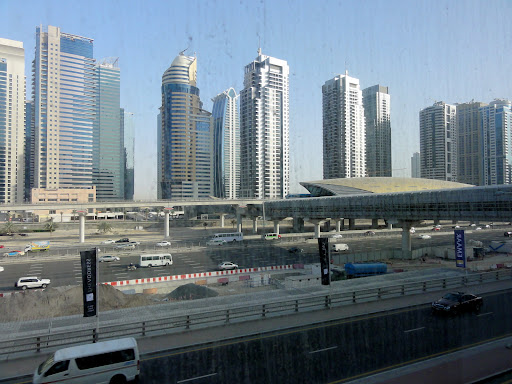 şi hai să mai încerc o dată telefonul – porneşte! Sun la hotel, îmi zice „coborâţi la Jumeirah Towers” şi apoi îmi explică destul de complicat cum să ajung, pe jos, la cerere. Mă uit – staţia are două ieşiri, Dubai Marina şi Jumeirah Towers – pentru a ajunge la cea din urmă trebuie să parcurg un coridor ce traversează toată autostrada.