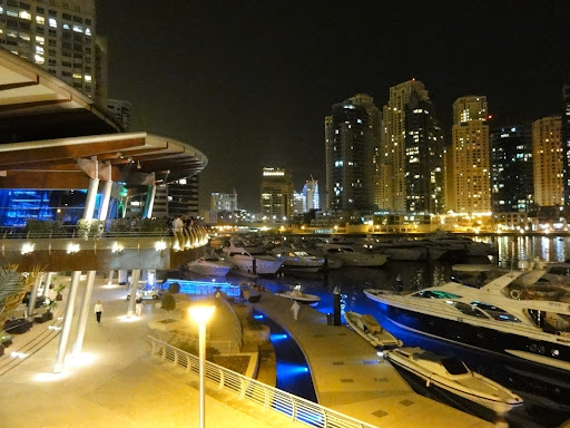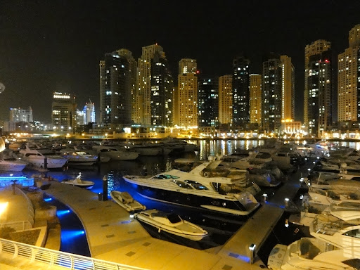 C. mă lasă în apropiere de hotel – nu reușim să găsim adresa exactă, traficul e aglomerat, așa că îi zic să mă lase unde poate, să nu mai pierdem o oră prin cartier – se dovedește o decizie foarte bună, pentru că absolut din întâmplare, mergând pe jos, dau de o clădire rotundă între blocuri, care-mi trezește interesul. Și ghici ciupercă – era chiar Dubai Marina, portul modern și luxos, cu terasă rotundă și iahturi la scară.