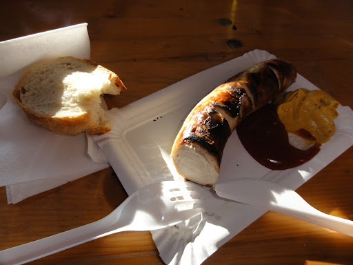 Niște voluntari creștini împart cârnați, paella, pâine și bere la mulțime, iar o trupă probabil locală întreține atmosfera.