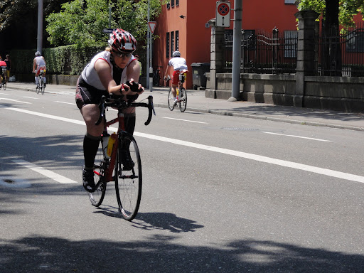 După 3,8km înot ieși cam amețit din apă. Unora le ia ceva timp să se orienteze, să-și dea seama pe ce lume trăiesc și să ajungă la biciclete. Repede pielea de rechin jos, pe dedesupt majoritatea au hainele de bicicletă – încalță pantofii, pun casca și la drum. Stăm după gard și-ș urmărim pe R. un pic, C. îi strigă să pună o pungă de plastic peste hainele de fugă în caz că plouă, R. e un pic întrerupt din concentrare, dar se conformează dând afirmativ din cap – e bine, e atent, putem fugi să-l vedem la ieșirea de pe covorul albastru