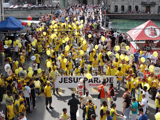 care începe să bată sincron la tobe. Când ne uităm mai de aproape, sunt mulţi copii şi tineri cu pancarte de genul „Jesus is my lifestyle”, „Jesus parade”, ş.a.