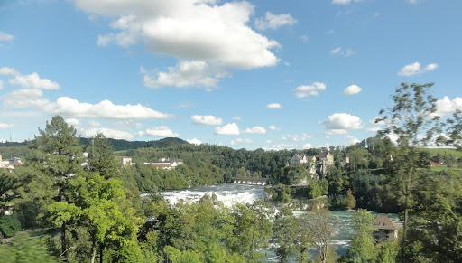 Nu, deci din tren, sau autobuz, sau alte mijloace de transport în mișcare nu se pot face poze ca lumea. De când am descoperit asta mă fascinează: scena de mai jos, de exemplu, cu ochiul liber am văzut-o în toată splendoarea – cascada rinului, clar, castelul, râul, culorile. NICI N-AM VĂZUT COPACII, creierul filtrează chestiile astea. Camera, nu, ea redă ”ce vede lentila”, iar lentila ei a văzut copacii care obstrucționează vederea.
