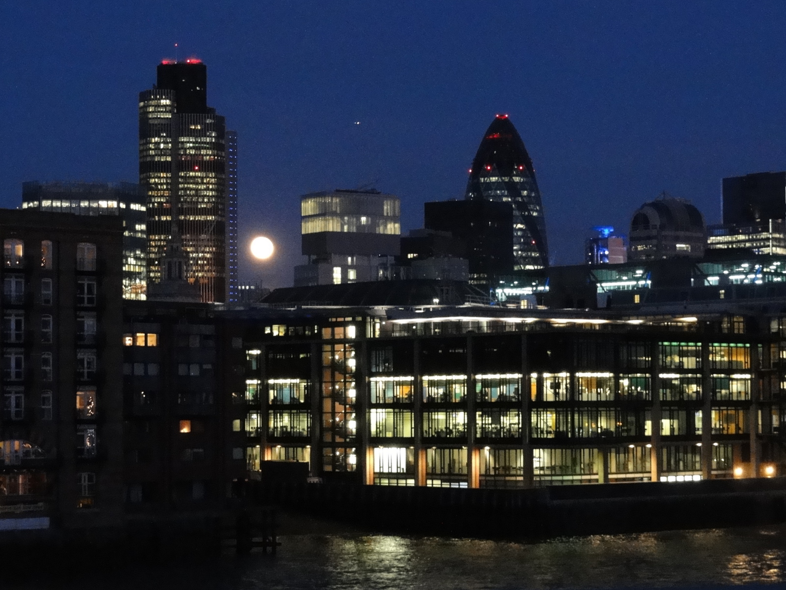spre tremuriciul lui V. – s-a lăsat frigul. Dar tot V. e responsabil cu ultima parte a întârzierii – el a fost cel care a observat luna răsărind dintre blocuri. Evident că am mai stat câteva minute s-o pozez în fel şi chip (n-au ieşit, că mi-a trebuit zoom, deci camera mică, deci poze slabe noaptea), alăturându-ni-se alţi gură-cască fascinaţi de peisaj.