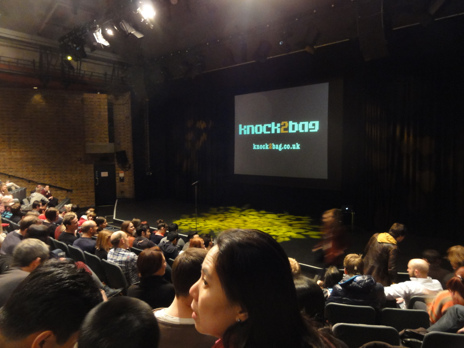 Spectacolul de comedie în picioare stand-up (doar comedianții, nu spectatorii) se numește knock2bag Christmas Party Habar n-am ce înseamnă, precis e un joc de cuvinte. Mie îmi vine mereu în minte ”not too bad”, dar nu cred că înesamnă asta. E la teatrul Mermaid, care se dovedește de fapt un fel de centru de conferințe, nu prea ”cald” pentru o sală de teatru, dar are scenă? Are.
