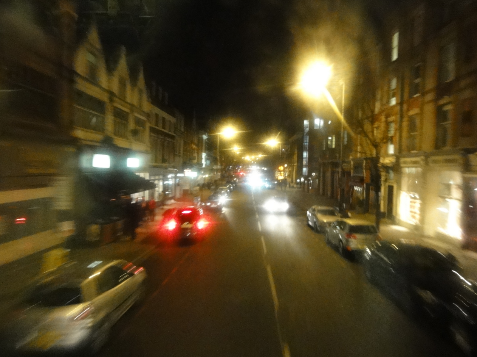 de unde am luat un autobuz supraetajat spre casă – fiind târziu în noapte am prins locuri chiar în față, sus.