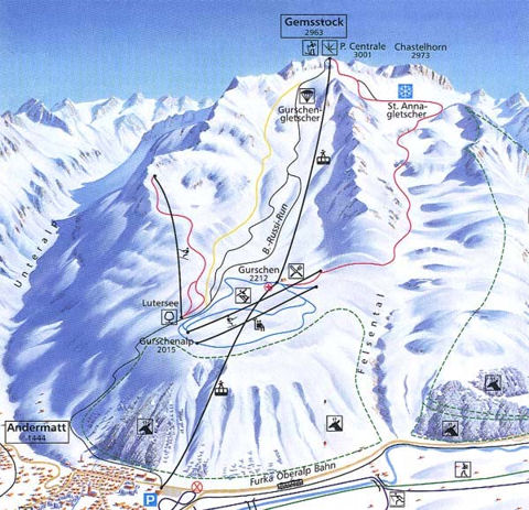 Duminică am zis să încerc ceva mai departe și poate mai puțin aglomerat, m-am hotărât dimineața pentru Andermatt, scria că au zăpară ”pulbere” de 3m. Au doar două pârtii roșii (dificultate medie, de nivelul meu adica), una neagră (dificila) bifurcată și una galbenă (dificila si netasată).
