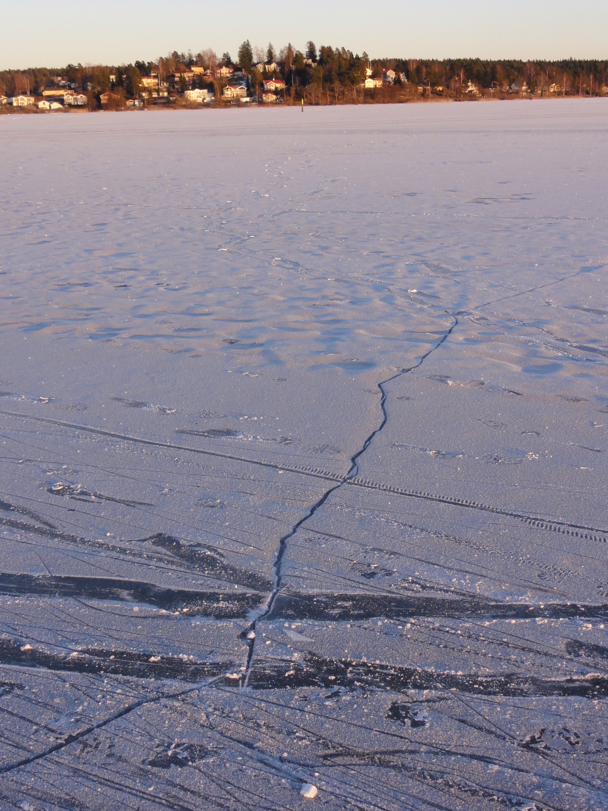 Cochetez cu ideea de a mă întoarce – soarele stă să apună, n-am de gând să mă prindă noaptea pe-aici. Nici nu gândesc bine gândul, când prrrrr, parcă zgomotul trece fix pe sub picioarele mele, nu știu dacă am simțit vibrația sau doar am auzit-o – gata. Înapoi. Merg repejor – în continuare nu cred că e periculos, dar zgomotul are ceva unheimlich care, culmea, mă exaltează. Abia acum îmi dau seama că mi-am dorit dintotdeauna să merg pe un lac înghețat – așa că savurez fiecare pas.