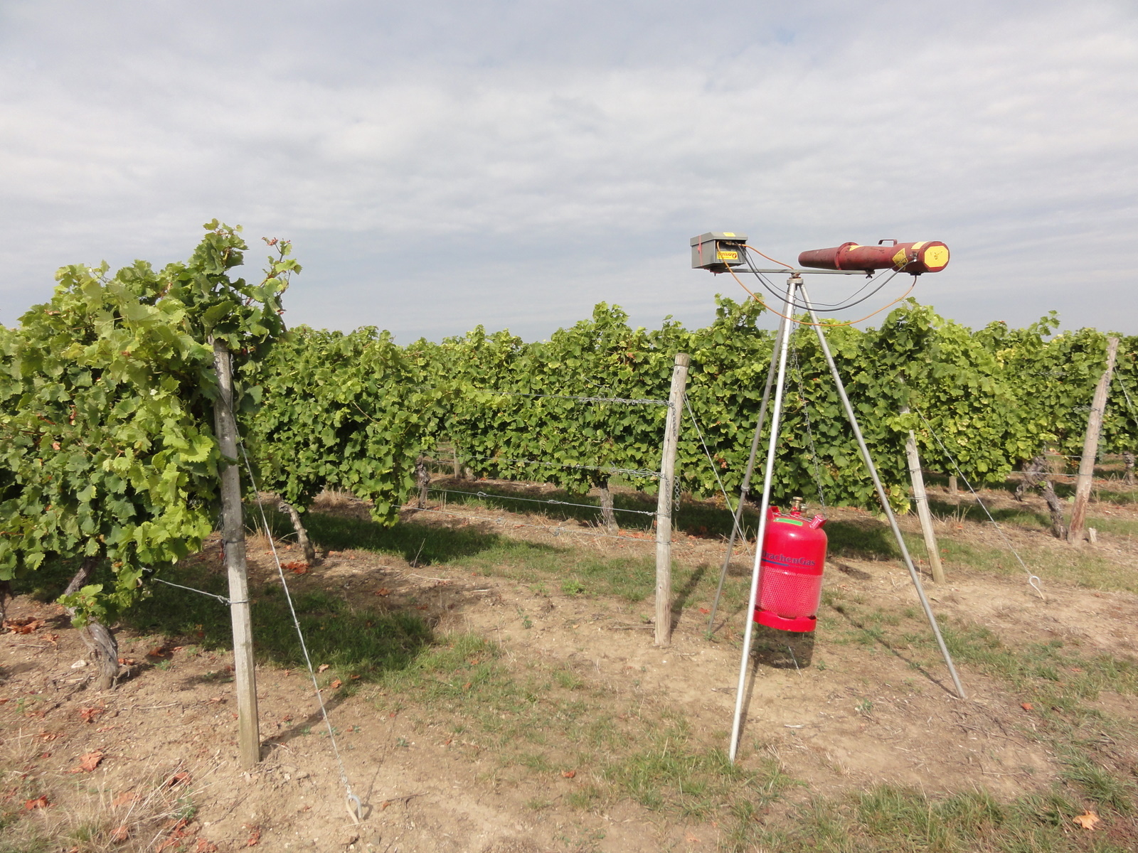 e un tun cu aer comprimat, să sperie păsările. Nu m-am prins dacă pușcă la intervale periodice sau are senzori de mișcare, cert e că pușcă tare.