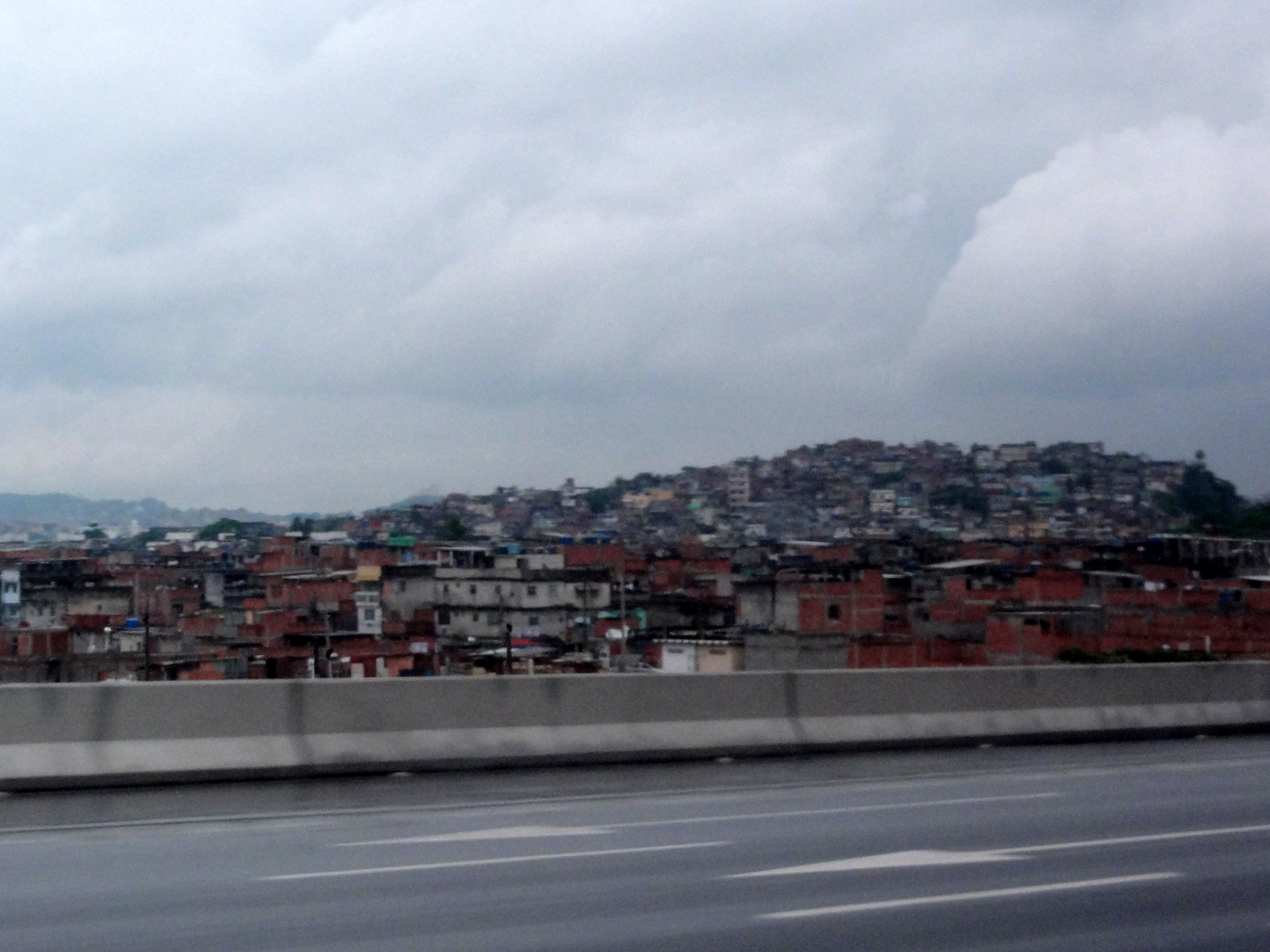Mă întorc la timp (la fix, adică) pentru a lua un taxi comandat de la hostel (nu agățat de pe stradă, chiar dacă aseară din fața barului din Lapa l-am luat și n-am avut probleme). De data asta fac niște poze din mașină la favelele pe lângă care trecem, dar nu ies din păcate, mai toate mișcate. Cam așa arată: