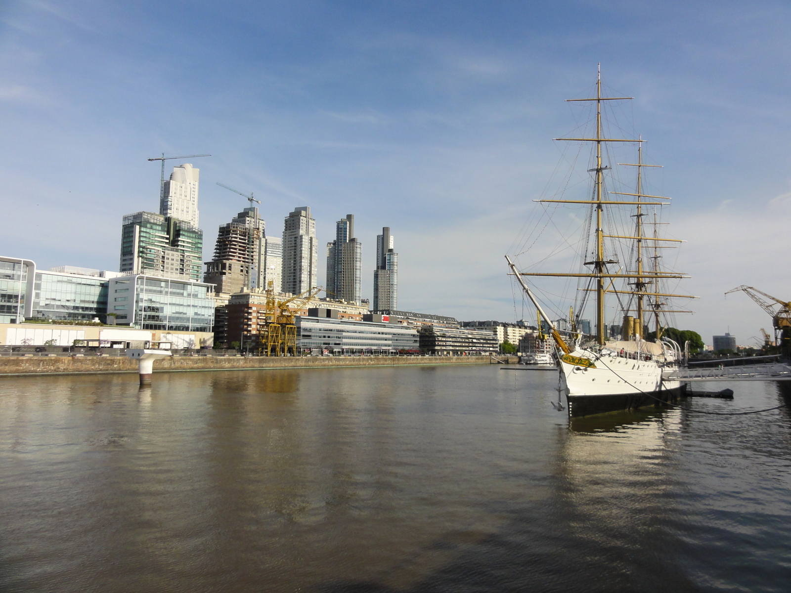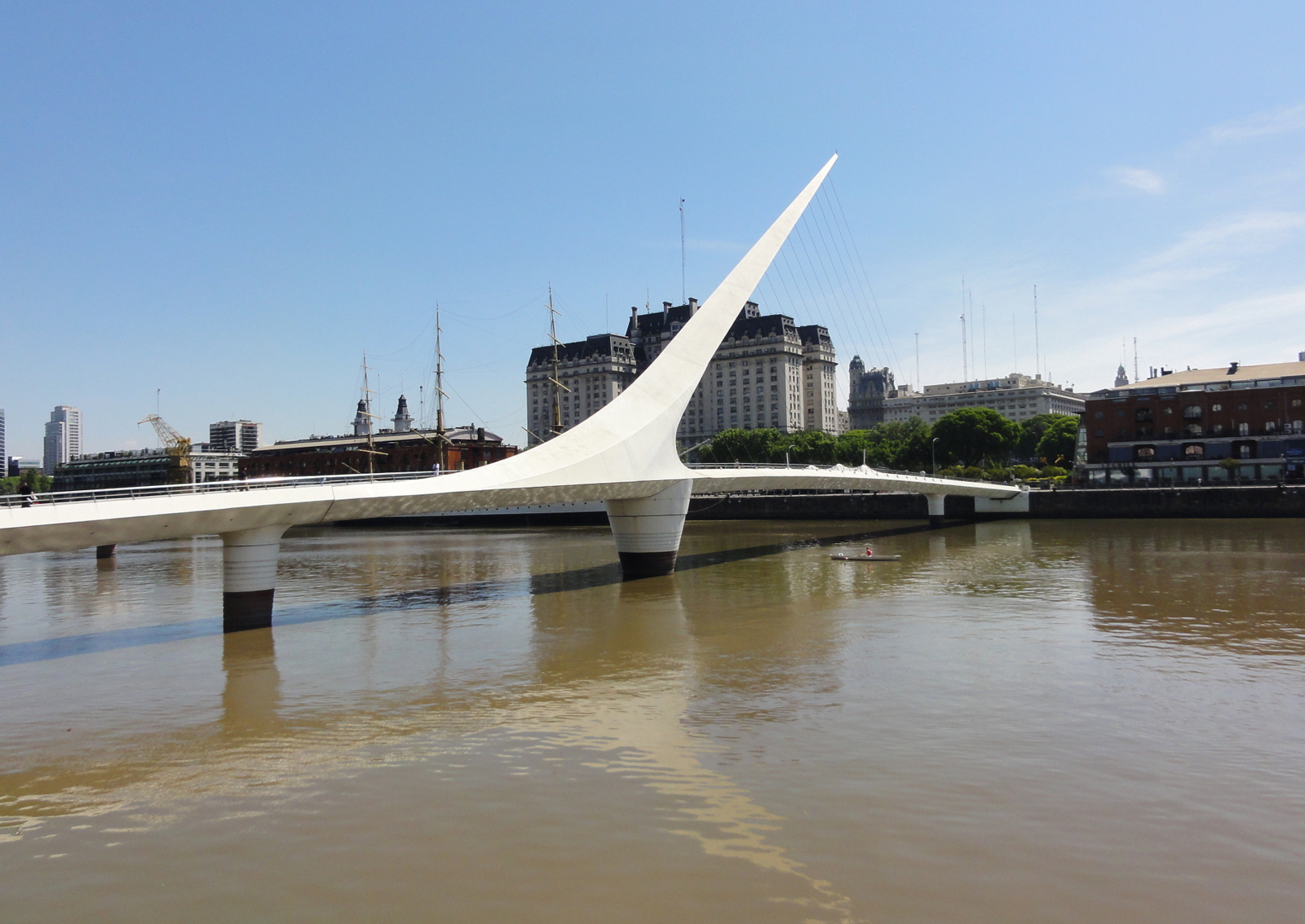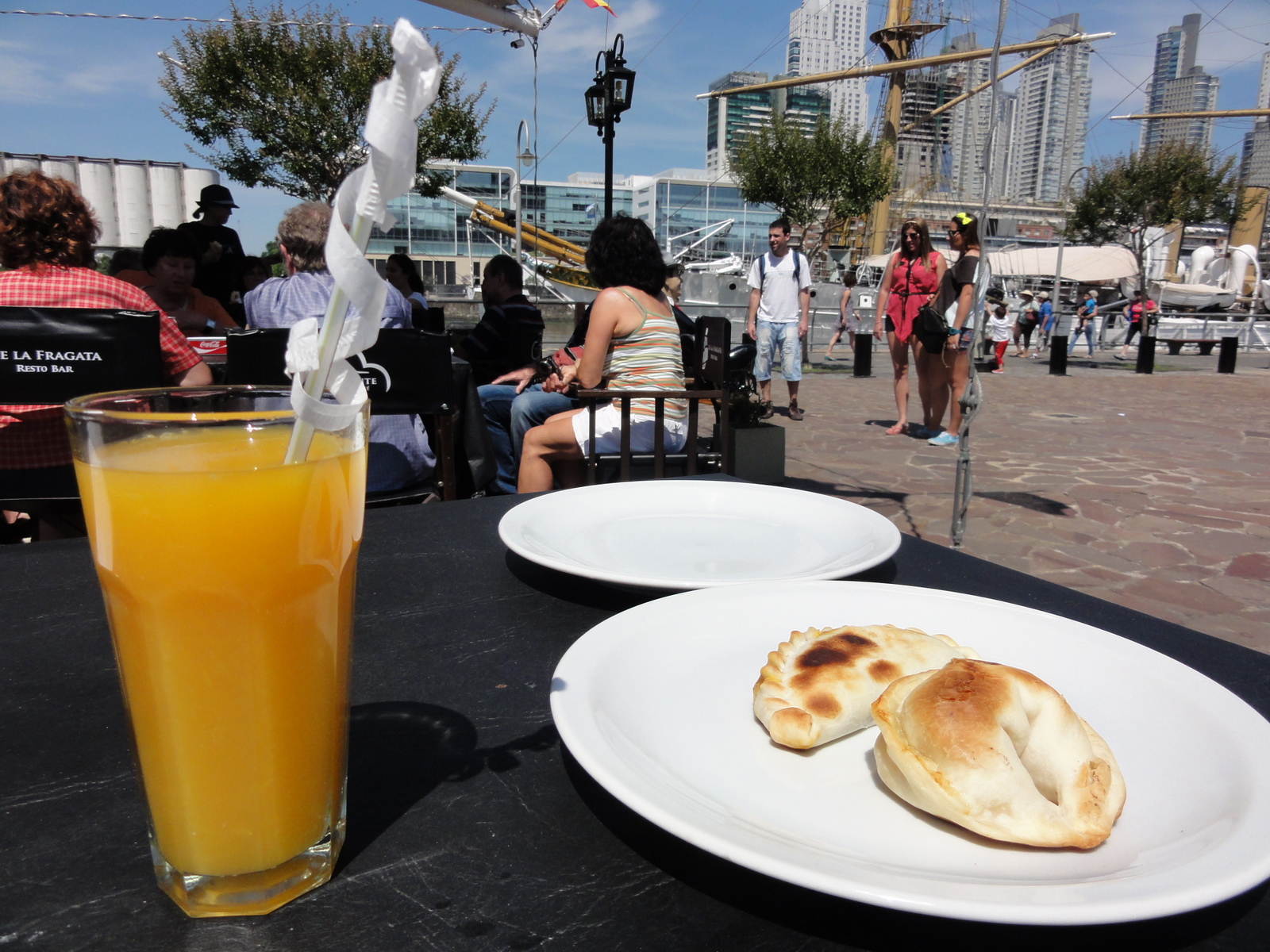 Puerto Madero e aproape pustiu în arșița zilei de grevă. Majoritatea restaurantelor sunt închise, dar nu toate. Găsesc loc la o terasă ”spărgătoare de grevă” nu departe de Puente de la Mujer și de vaporul adiacent, petnru două empanadas și un jugo de naranja.