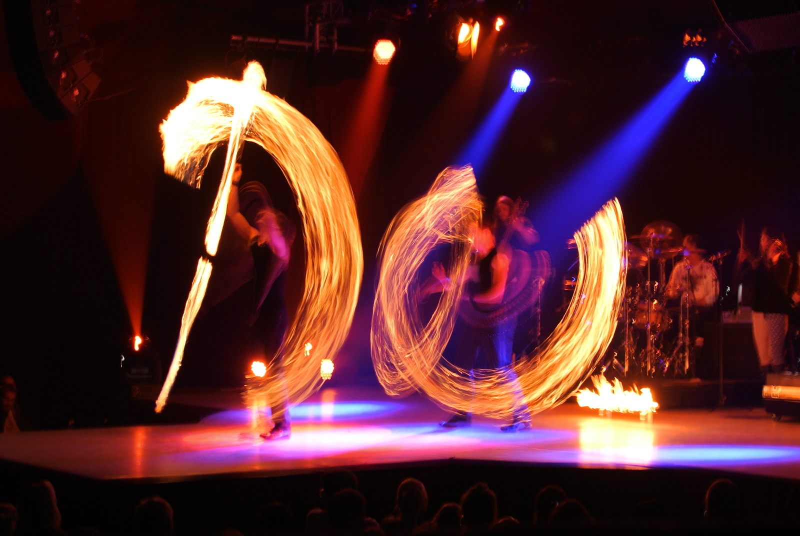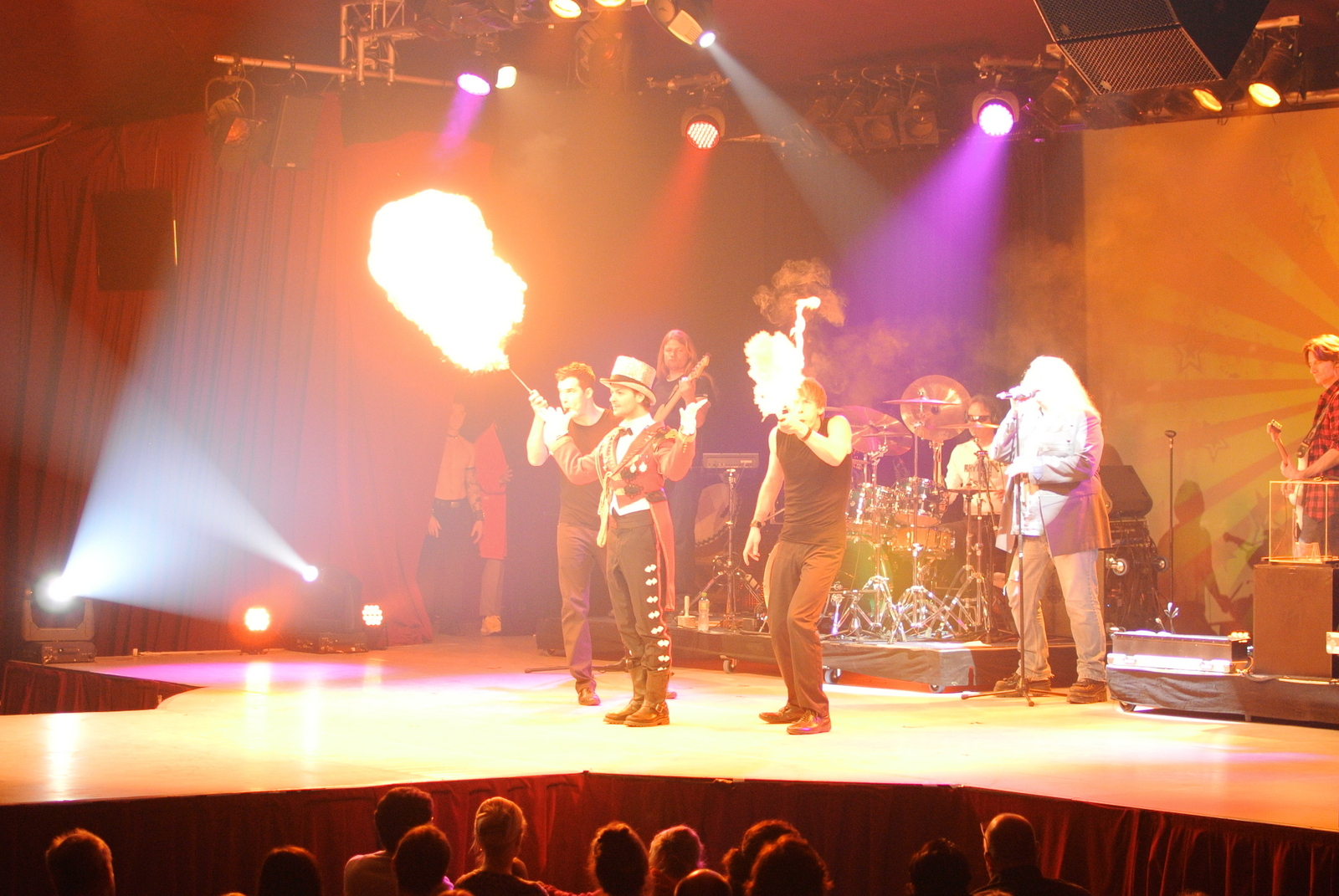 Au fost câteva numere interesante, dintre care cel mai bine fotografic s-a pretat, desigur, cel cu foc. Pozele largi sunt cu Panasonicul compact, cele cu scena cu Nikon V1, obiectiv de 35mm 1.8 (transformat datorită factorului de ”crop” al micului senzor în 105mm), care s-a potrivit la fix cu locul unde am stat: