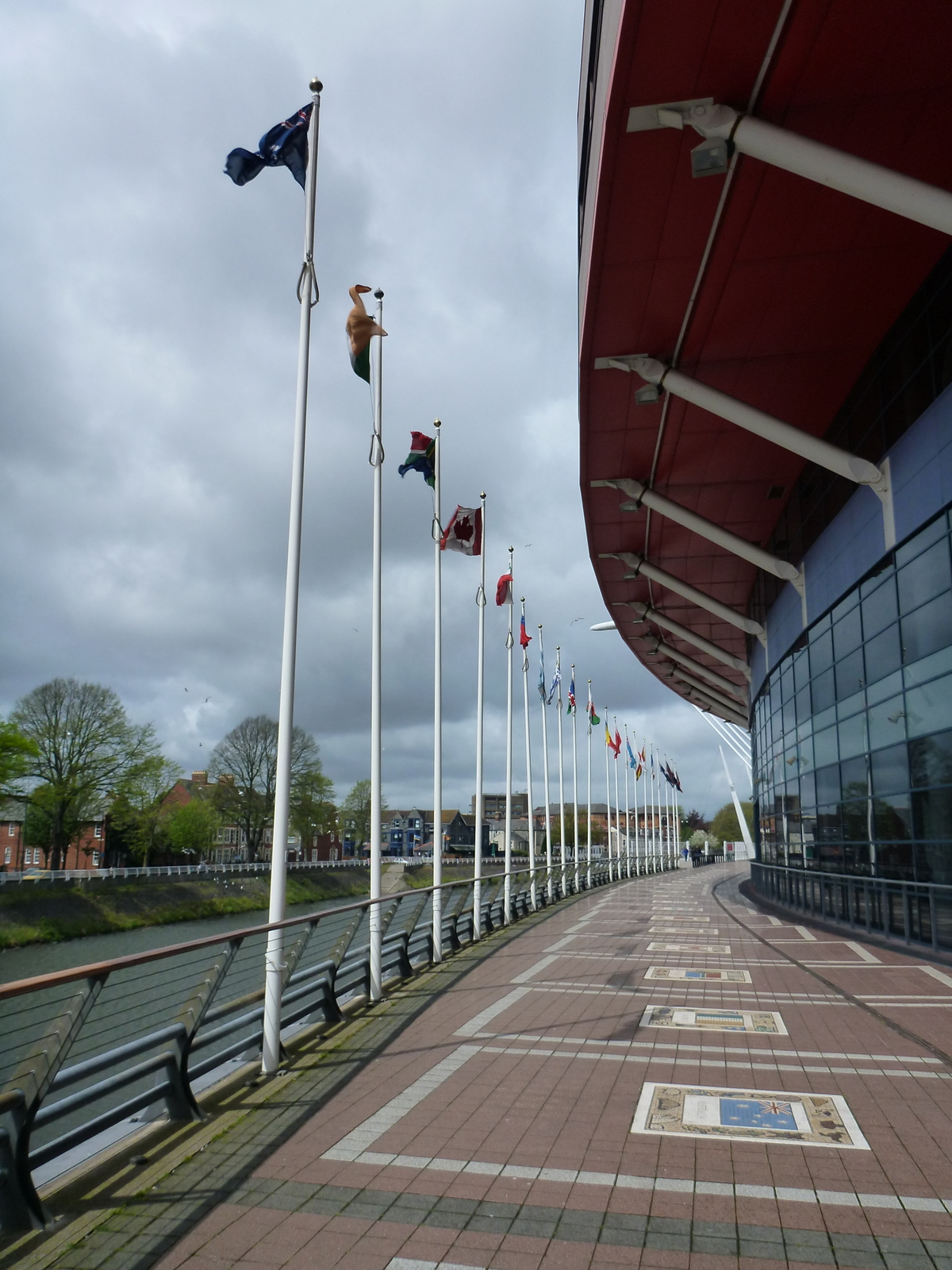 Stadionul Millennium este templul rugby-ului galez, sport la care sunt mult mai buni decât la fotbal. Îl știu de Arms Park, de pe vremea când în turneul celor 6 națiuni erau doar 5. Nutresc speranța că e ceva meci azi – deși vremea nu e încurajatoare, m-ar tenta. La stadion însă nici țipenie de om, casa de bilete închisă – deduc că nu e nimic în program. Îi dau doar un ocol, găsesc steagul Românieie alături de alte națiuni rugbistice, încrustat în podea alături de imagini sugestive – chiar sunt curios ce-au ales pentru România pe lângă frunza de ștejar.