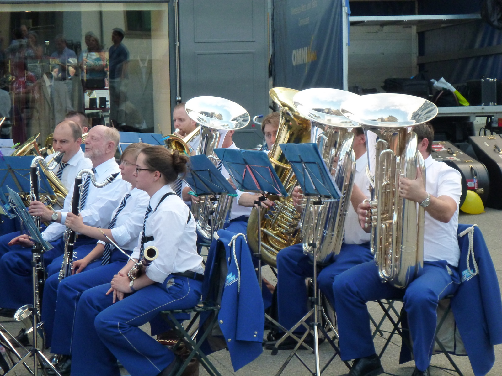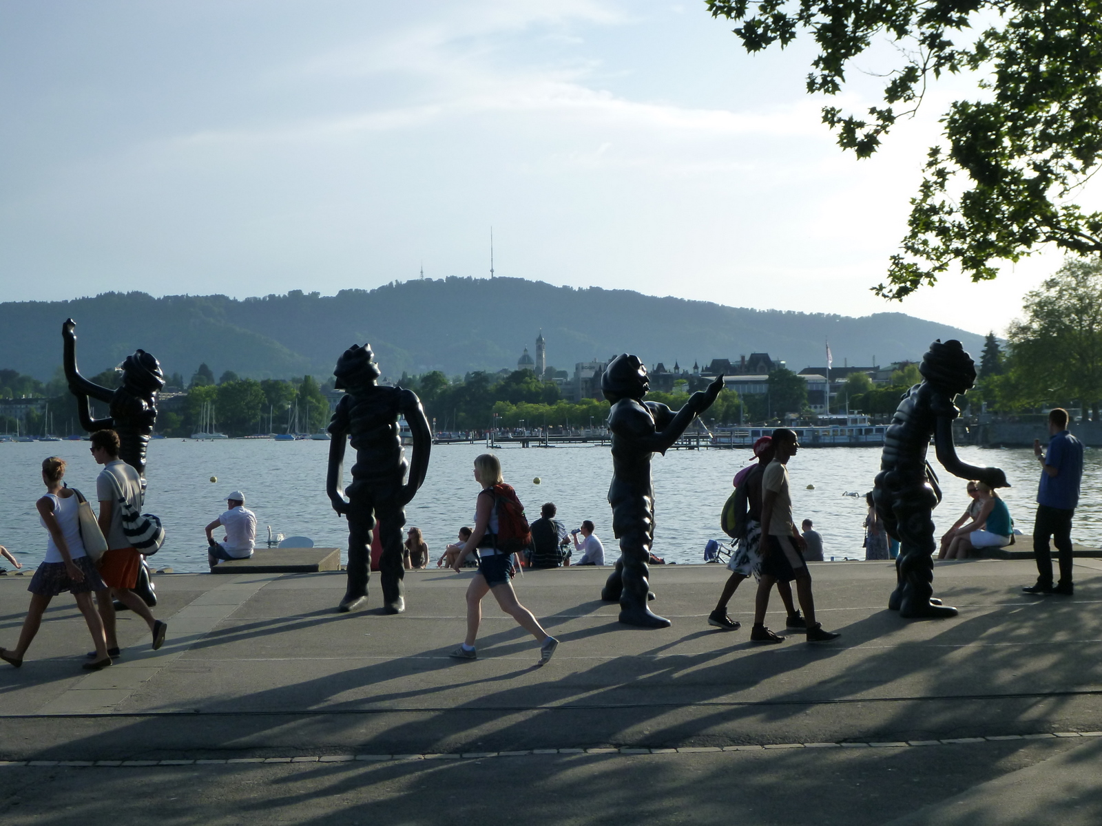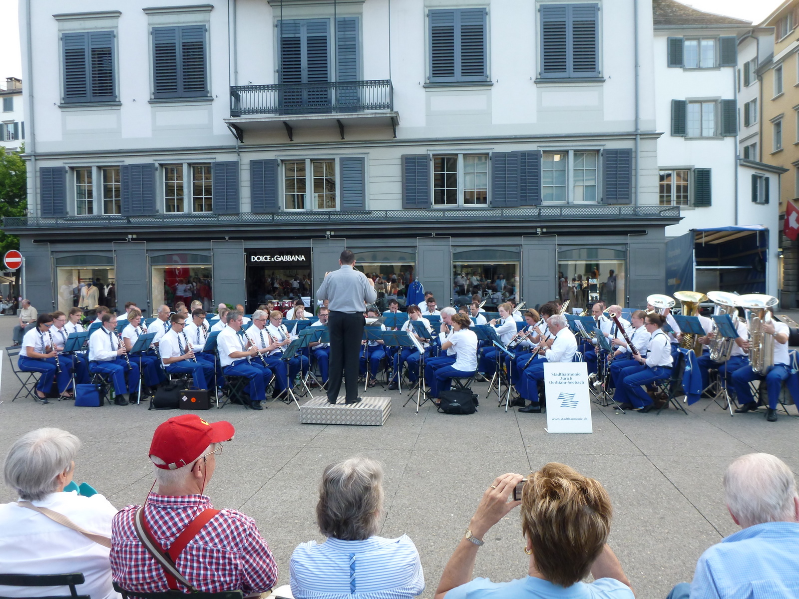 Hai prin oraș spre casă, e frumos, mai clătesc un ochi doi la priveliște. Când colo, dincolo de clasicul peisaj de relaș de pe malul lacului, la care s-au adăugat și niște ”mari spirite”, opere de artă expuse de fundația Beyeler, ajung să clătesc și urechi – cu coada ochiului observ niște uniforme într-o piațetă, de unde se aude sunet amplu de bucium. Sunt niște buciumari care exersează, în timp ce se așează o orchestră. Măi să fie. N-am răbdare să se așeze, văzusem ceva steaguri și auzisem muzică mai încolo pe un pod, merg până acolo să văd. Găsesc altă orchestră, mai mare, care tocmai începe să cânte. Frumos. Stau două cântece, 3 poze, mă întorc la buciumari – orchestra e gata, încep și ei. Nu știu care-i faza, ochesc un pliant cu ”concerte de vară” – foarte frumos. Merg mai departe spre gară, când aud sunet sacadat de tobe pe-o stradă-n sus. Nu pot să rezist la sunet sacadat de tobe, așa că poposesc și aici preț de două cântice.