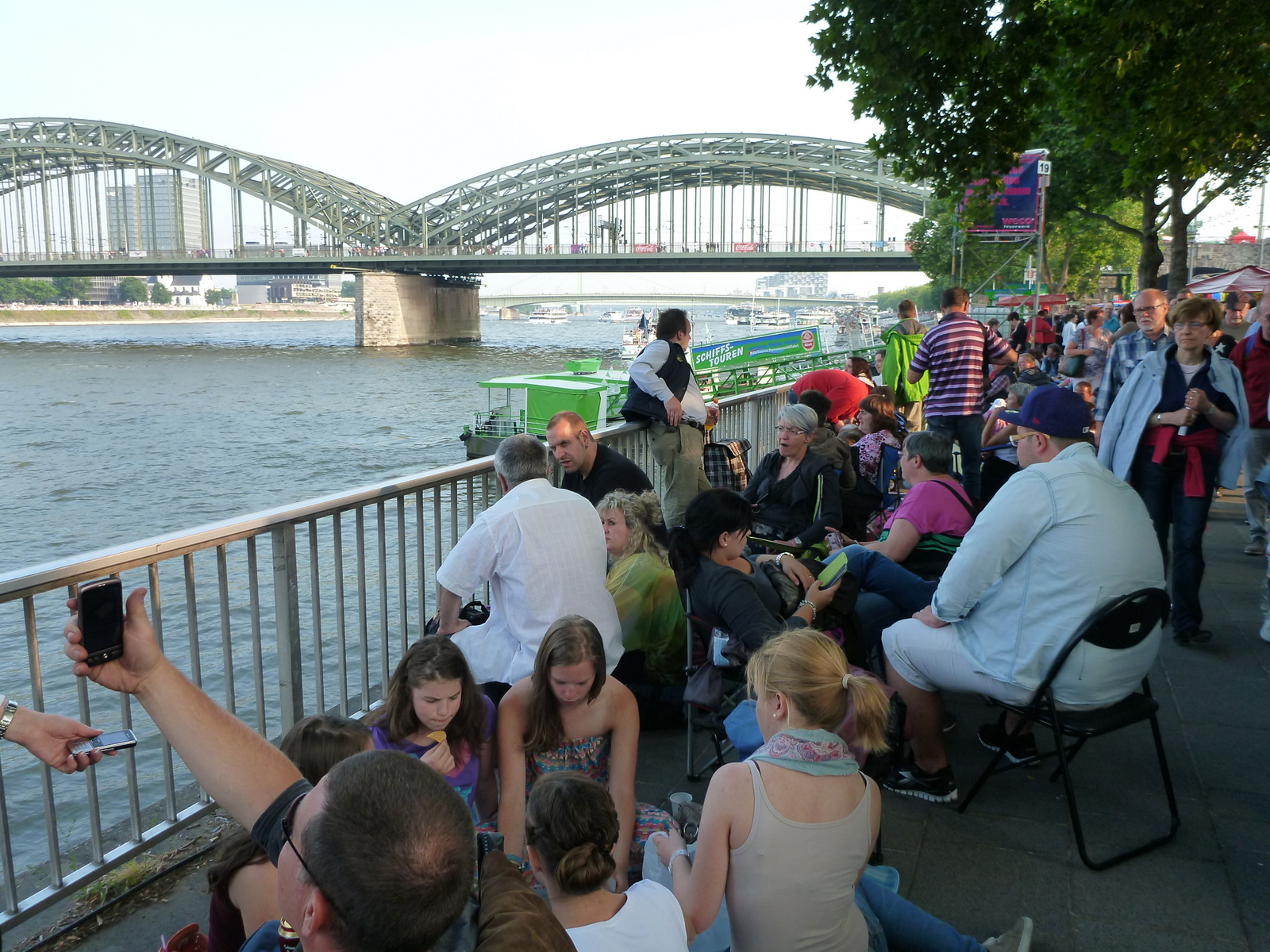 Cobor de pe trotuar până pe mal lângă apă și găsesc un locșor pe pietre – noroc că e o zi călduroasă, sunt calde. Îmbrac puloverul cu glugă și mă așez la un pui de somn. Mă trezesc, mai pac niște poze – malul de vizavi e deja plin de lume, scăldată în soarele seral, mai citesc un pic. La un moment dat vin niște spanioli și mă întreabă dacă vreau să mă dau mai încolo să încapă și ei – mă uit în sus, s-a aglomerat situația. Ne înghesuim, asta e. Nu durează mult și apar zepelinele, iar după zepeline, pe la 9:30 începe cursa de canotaj 8+1. Din păcate se termină după pod, depaarte de noi, vedem bărcile abia la retragere. Așa e dac-am ales să stau departe, nu ești în mijlocul acțiunii. Măcar bine că m-am oprit la timp, chiad după ultimul ”turn sonor” cu boxe, aud radioul care dă muzica de la concertul de peste Rin.