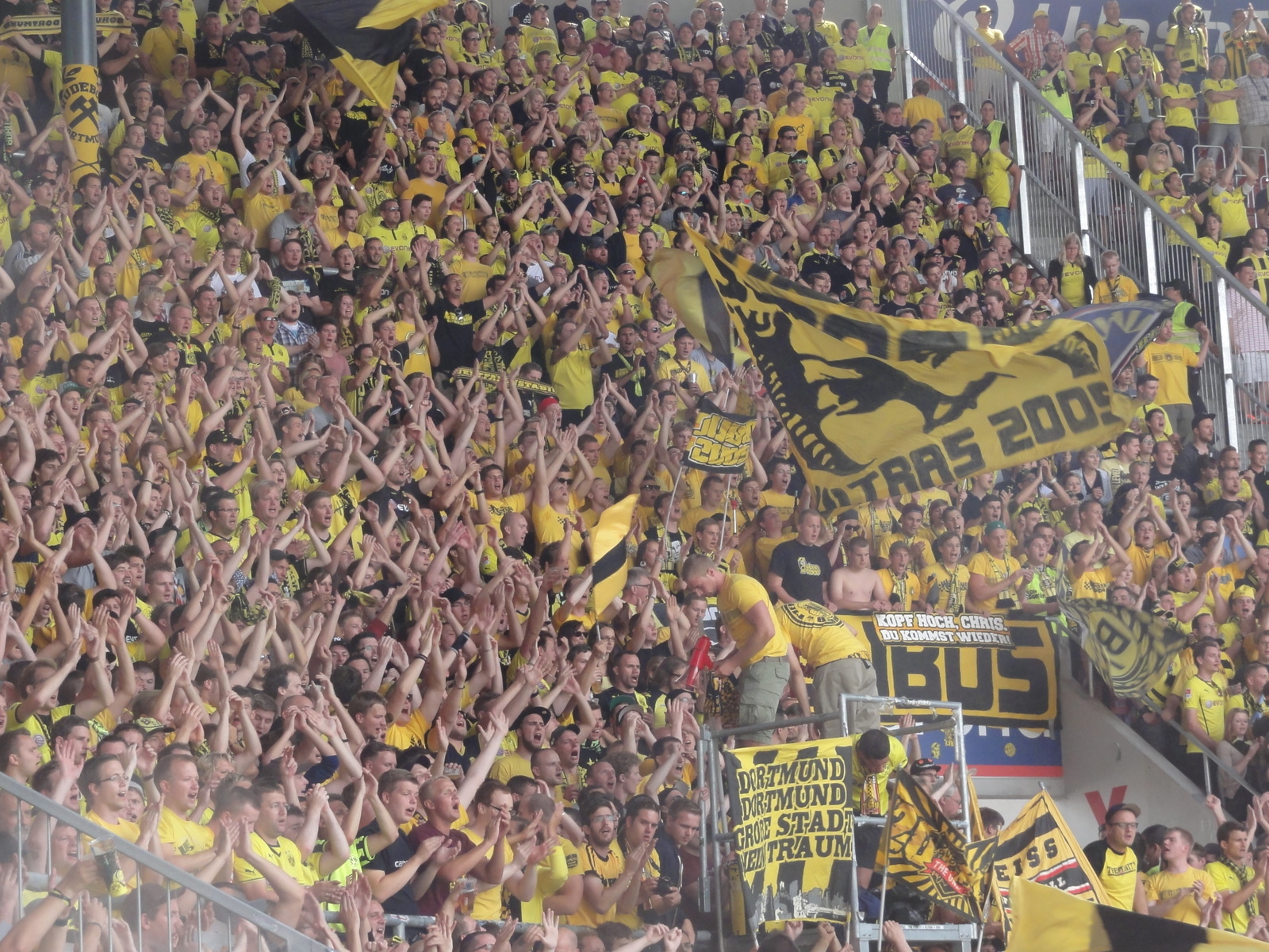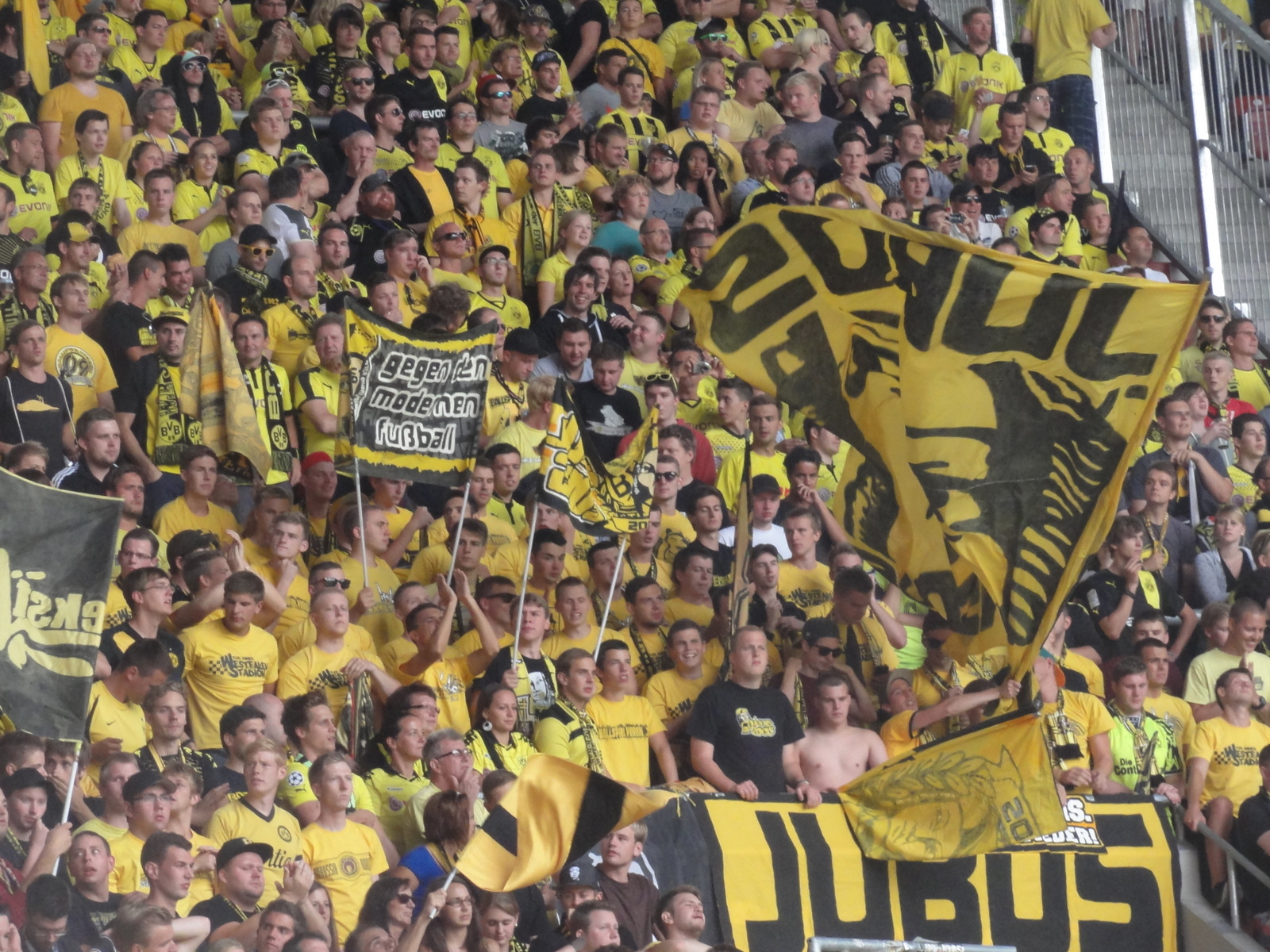 Luăm loc lângă fanii Borussiei, într-un amestec de tricouri galbene cu roș-verzi, dar toți ochii sunt pe triunghiul galben din colțul stadionului.