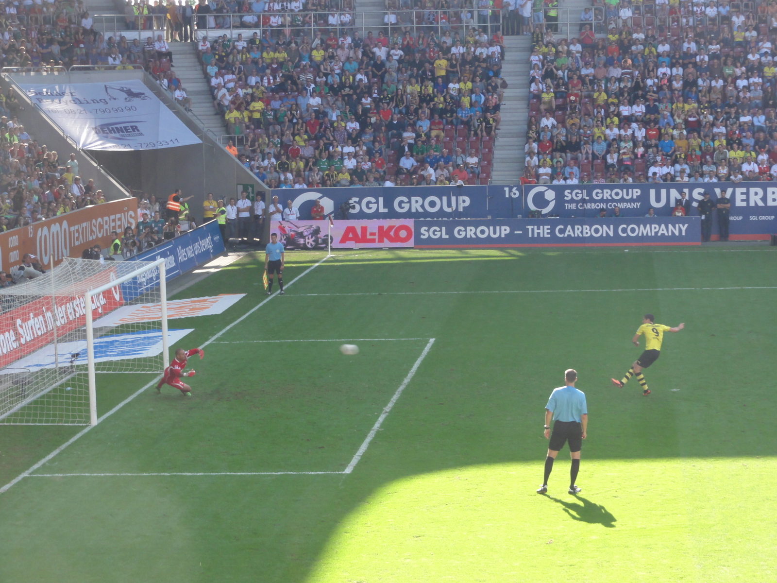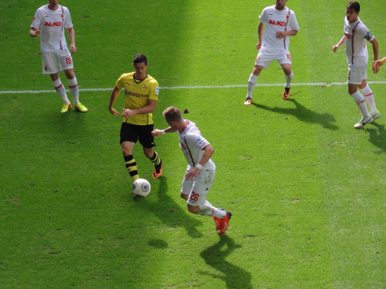 Iar Borussia se descătușează, Augsburg nu mai joacă nimic. Ocaziile abundă, se face în curând 3-0, același simpatic Aubameyang, jucătorul cu cel mai rapid din lume, cică are accelerație mai mare ca Usain Bolt pe primii 40m (”Asta da politică de transferuri”, zice unul din băieții din spate, cu care între timp batem cuba la fiecare gol). E ovaționat la mii de decibeli când e schimbat. Nu la fel se întâmplă cu Lewandowski, care e aplaudat, dar nu isteric, în ciuda unui gol din 11m, care cosființește scorul final, 4-0,