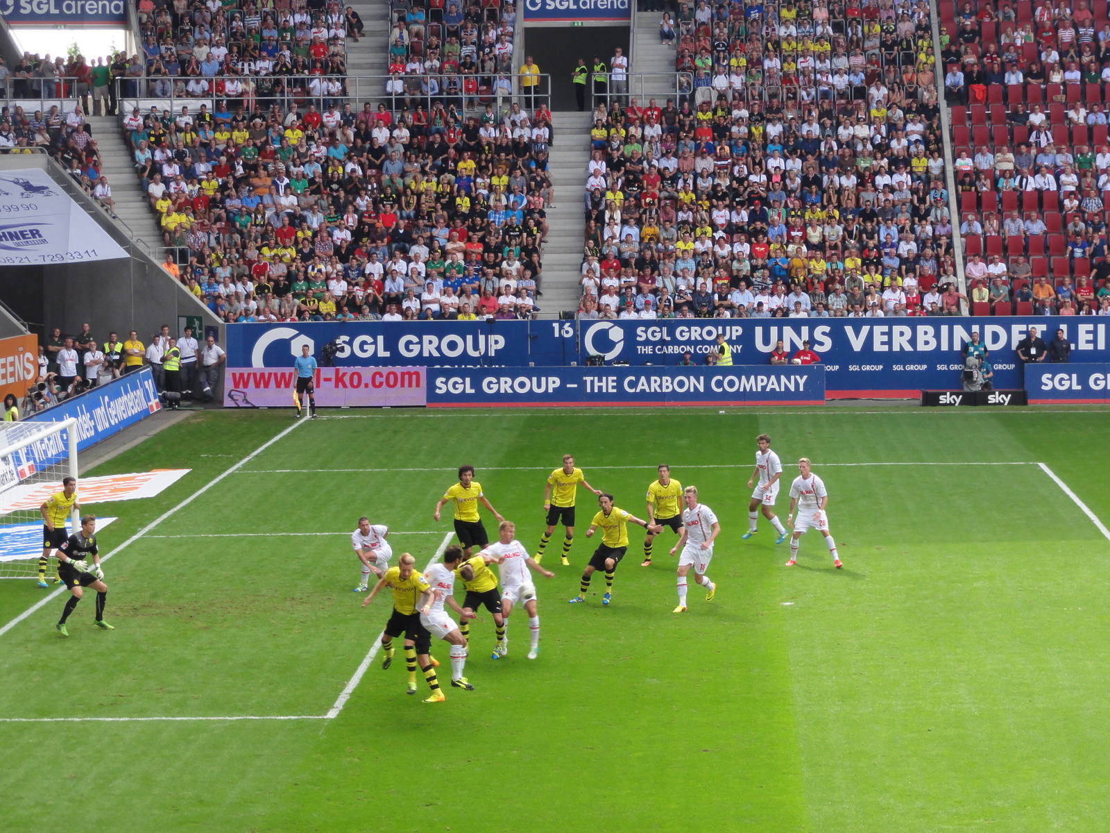 SGL Arena e un stadion de 30000 de locuri deosebit de cochet. Destul de nou, dupa cum zice S., modern, foarte placut, cu tribunele înalte până lângă gazon, să tot joci, să tot priveşti. Augsburg e un club mic (mda, văd ce înseamnă „mic” aici), dar cu doi sponsori puternici, care au investit cu cap, în timp, pentru creşterea performanţei. Deocamdată sunt la nivelul „abia ne-am menţinut în prima divizie după promovare”, să vedem ce le rezervă viitorul cu aşa stadion frumos. Sunt ceva locuri goale la tribuna 1, dar crainicul anunţă că meciul se dispută cu casa închisă, 30660 spectatori.