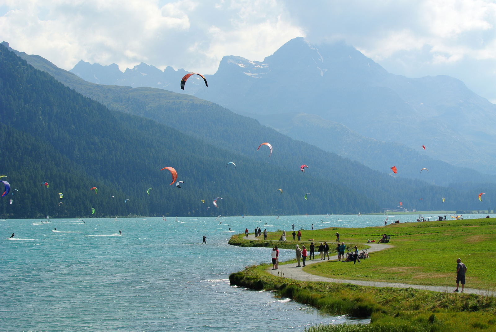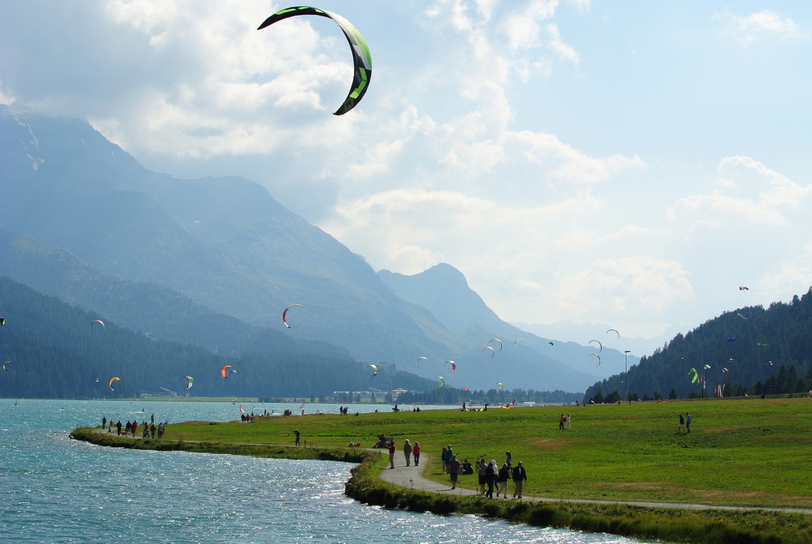 După coborârea foarte pitorească de la 3000m, am pornit spre casă, dar n-am ajuns departe: ne-au atras atenția niște fâșii colorate prin aer, deasupra unui lac. Kytesurferi, mulți, zeci de inși înghesuiți pe micul lac turcoaz (Silvaplana, aveam să aflu, lângă stațiunea Celerina, un St. Moritz mai puțin ”glamuros”, dar parcă mai prietenos. Rar am văzut ceva mai spectaculos (a se vedea și fimulețul din postul anterior).