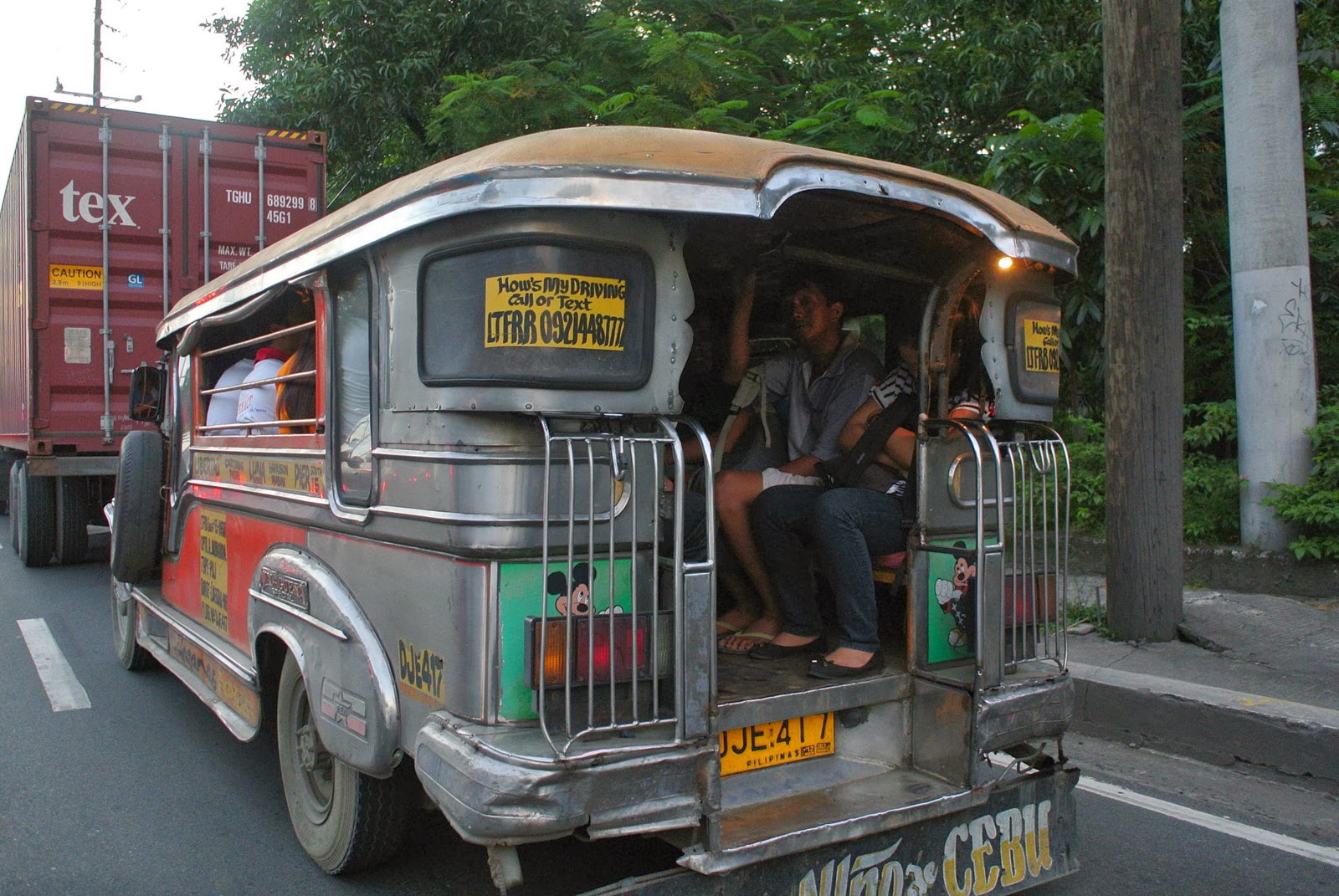 jeep-uri americane rămase după război, reparate, cromate, vopsite, botezate și modificate astfel încât să încapă mulți oameni în spate – sunt microbuzele Manilei.