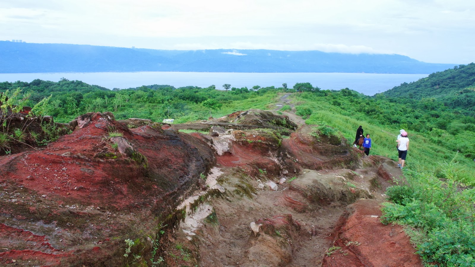 Probabil nu e indicat să mergi pe ploaie, cum era când am plecat noi, să nu aluneci pe pământul roșu și să te duci – suntem pe marginea craterului, e abrupt, nu mă încumet sus pe creasta roșie să fac poze, stau cuminte pe cărare,