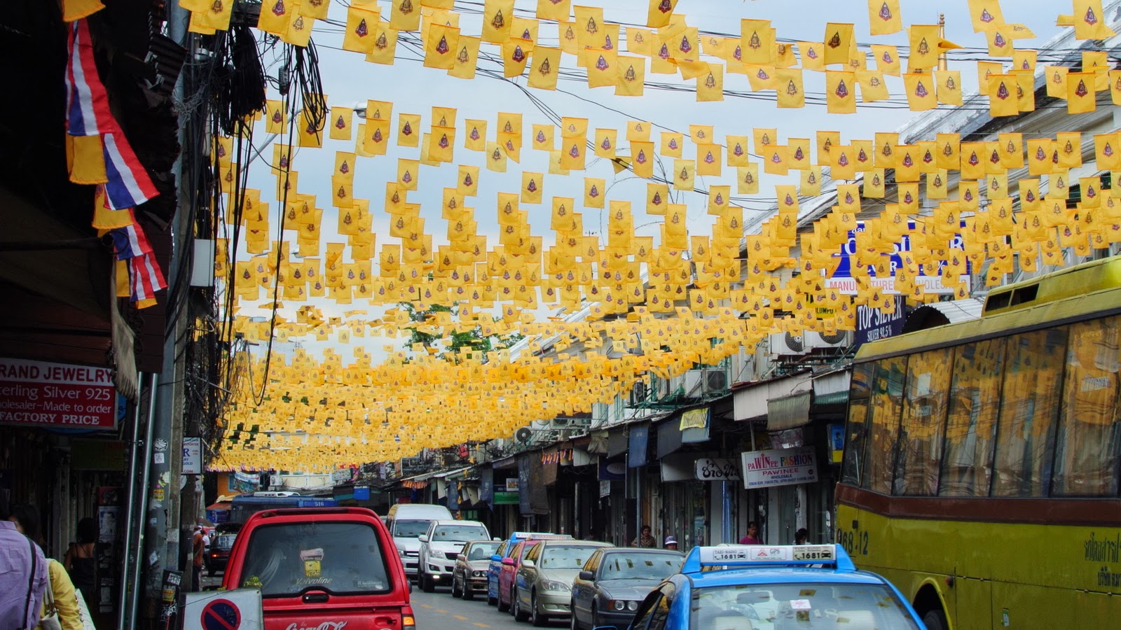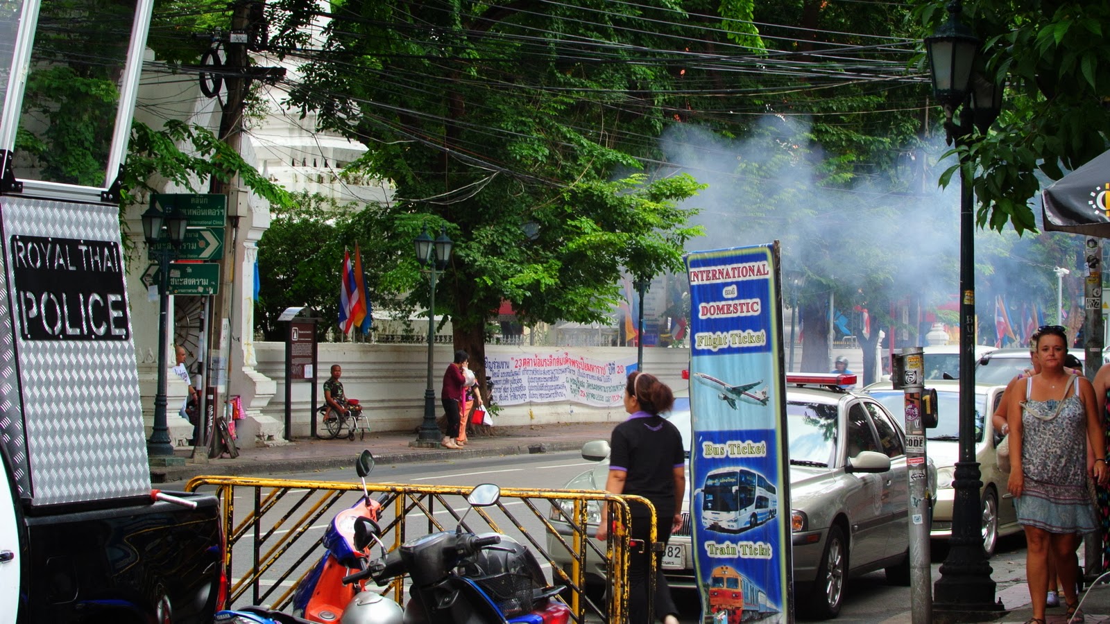 Nu știu dacă sunt protestatari ale cămășilor galbene sau roșii (am văzut din taxi că poliția a blocat cu scutieri anumite străzi unde urmau să se adune) sau doar niște artificii. Nu voi afla, pentru că mă întorc înapoi pe stradă, cu întrebarea dacă să merg cu microbuzul la aeroport sau tot cu trenul. Durează cam o oră, a zis omul de la standul turistic. E foarte ieftin, serviciu pentru backpackeri, dar nu știu dacă vreau să risc vreun blocaj în trafic. Până una alta mănânc un papaya proaspăt și extrem de bun de la standul de fructe, și-apoi mă așez pentru prânz la unul din cele două cele mai turistice localuri de pe stradă, vizavi de celălalt.