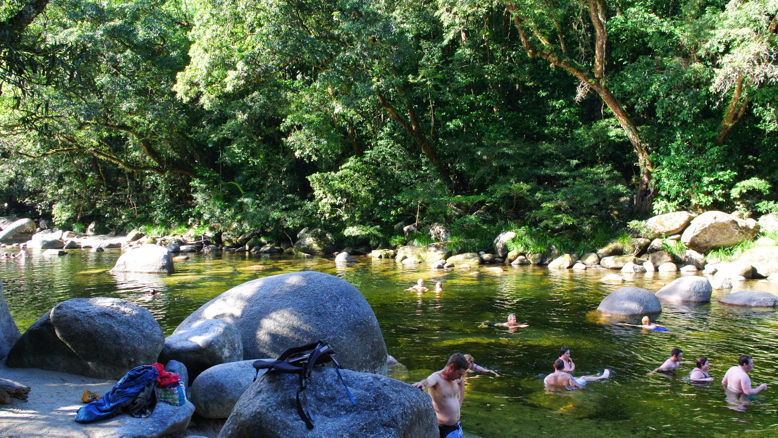 Gata plimbarea, ura și-n mașină, deh, așa-i în excursia cu program milităresc, mai avem o oprire, de data asta la un râu cu ape cristaline, stânci și multă lume în apă – cheile Mossman.