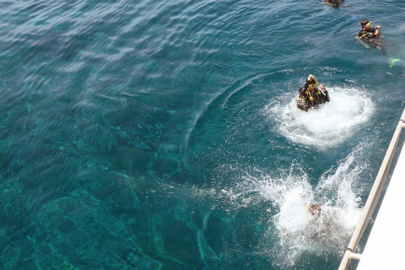 Ora petrecută în apă trece mai repede decât mă așteptam, mergem la următoarea locație. În total vom avea 3 opriri, în timpul celei de-a doua se servește și masa de prânz, pe care aproape că o ratez, stând prea mult în apă. Între timp mi-am adus aminte că la scufundări ne învățase să ne „suflăm masca” să scoatem apa, dar nu mai știu cum – îl întreb pe italian cum se face, și de-atunci nu mai am probleme, mult mai multă relaxare în apă.