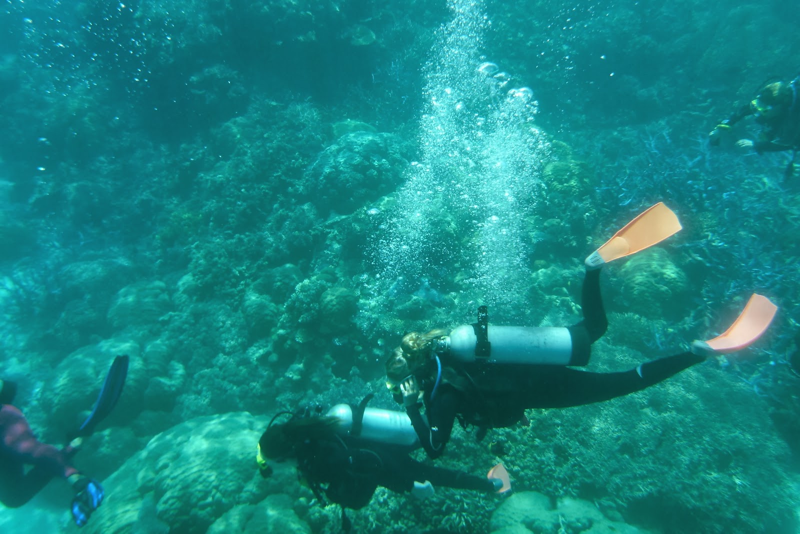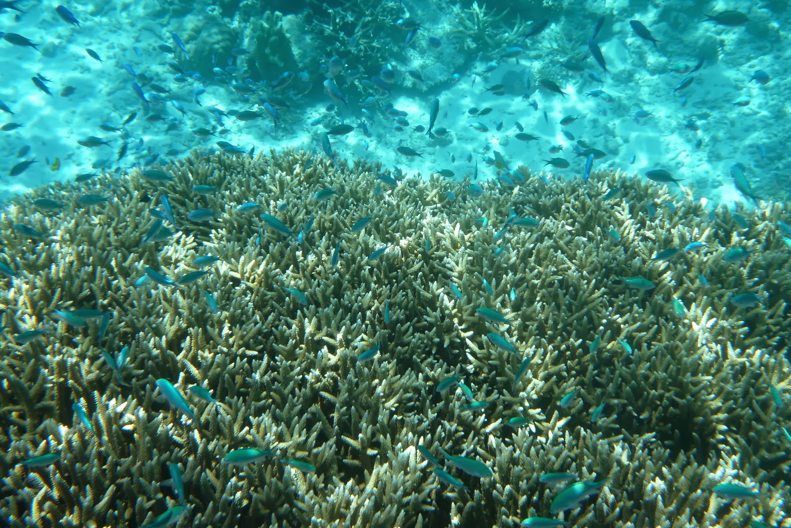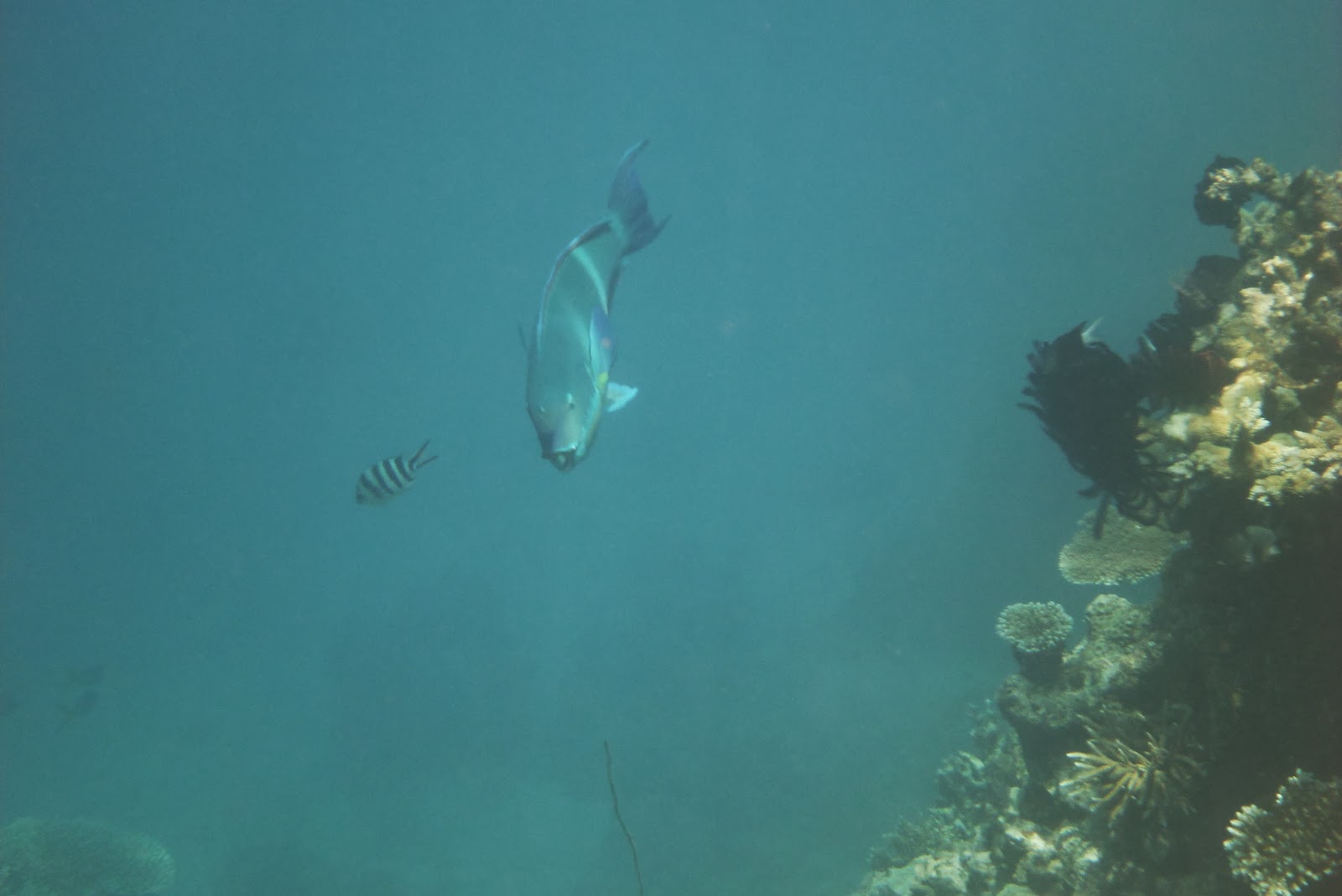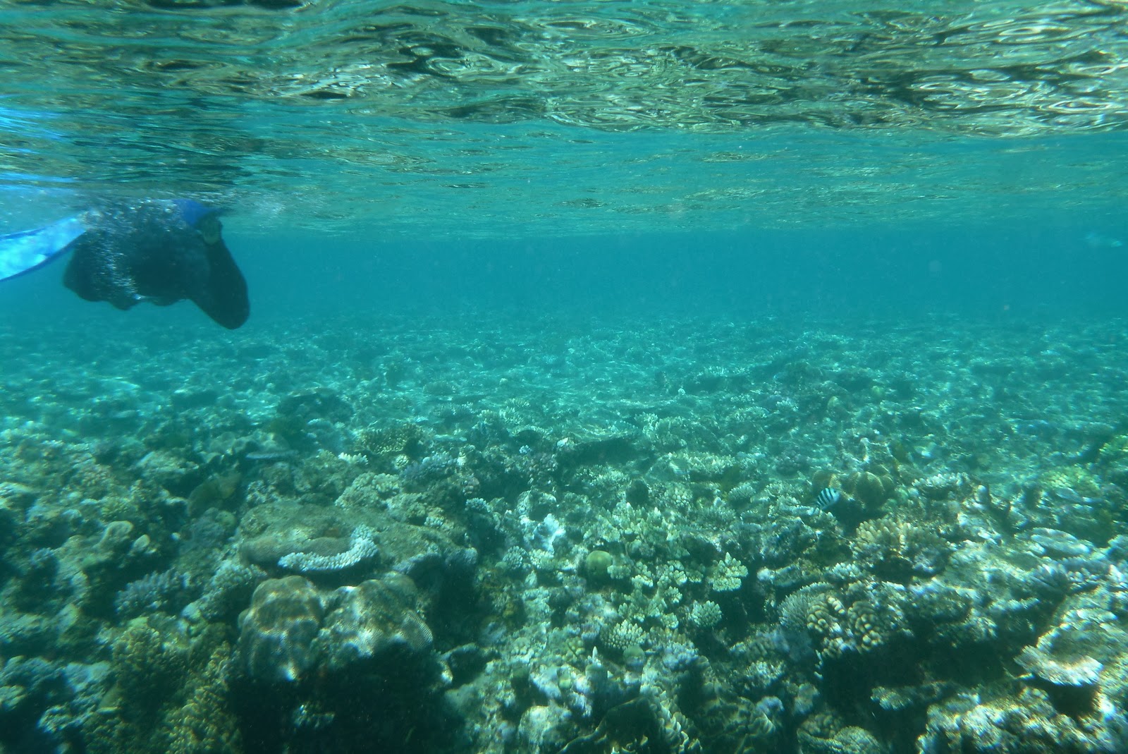 Reciful e foarte aproape de suprafață, e reflux, așa că nici nu avem voie să înotăm deasupra, să nu atingem coralii – atât pentru că nu e voie, cât și ca să nu ne lovim.