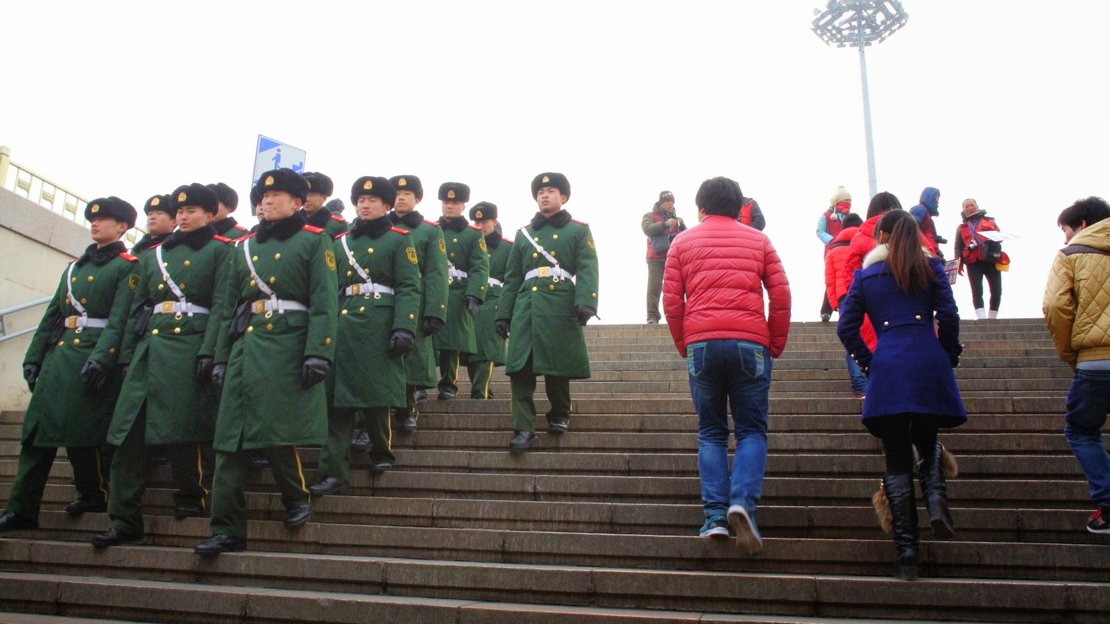 Da, contrastul e cum mă așteptam, dintre ce am în minte și ce văd în fața ochilor – chinezi din „clasa de mijloc”, îmbrăcați modern, plimbându-se liniștiți, pozându-se pe ici pe colo. Doar uniformele izolate de soldați atenți aduc aminte că locul e „obiectiv strategic” în felul lui.