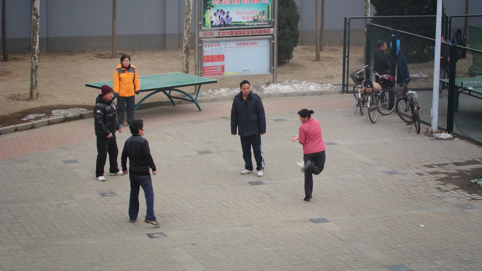 de unde vezi cea mai faină imagine a zilei: cetățeni de toate vârstele jucând pingpong și mai ales un fel de „săseasca fără poartă” cu o minge cu pene. Crâmpei din viața unui Peking-nez, așa ceva nu vezi din taxiu sau metrou.