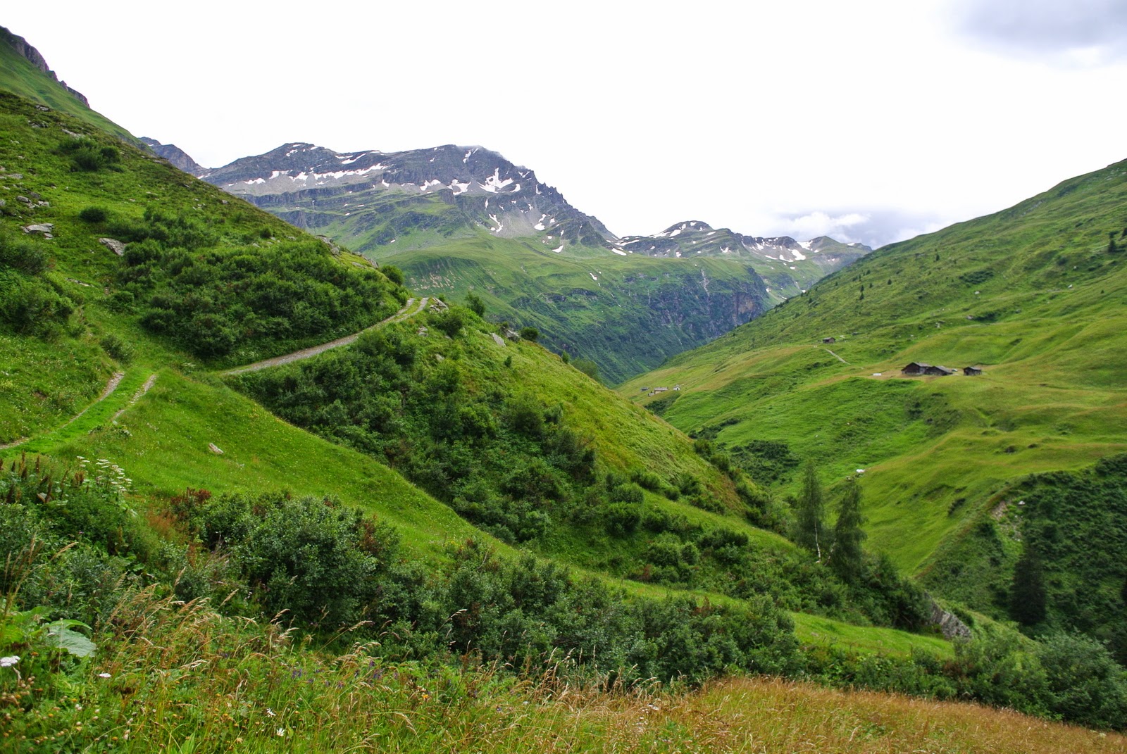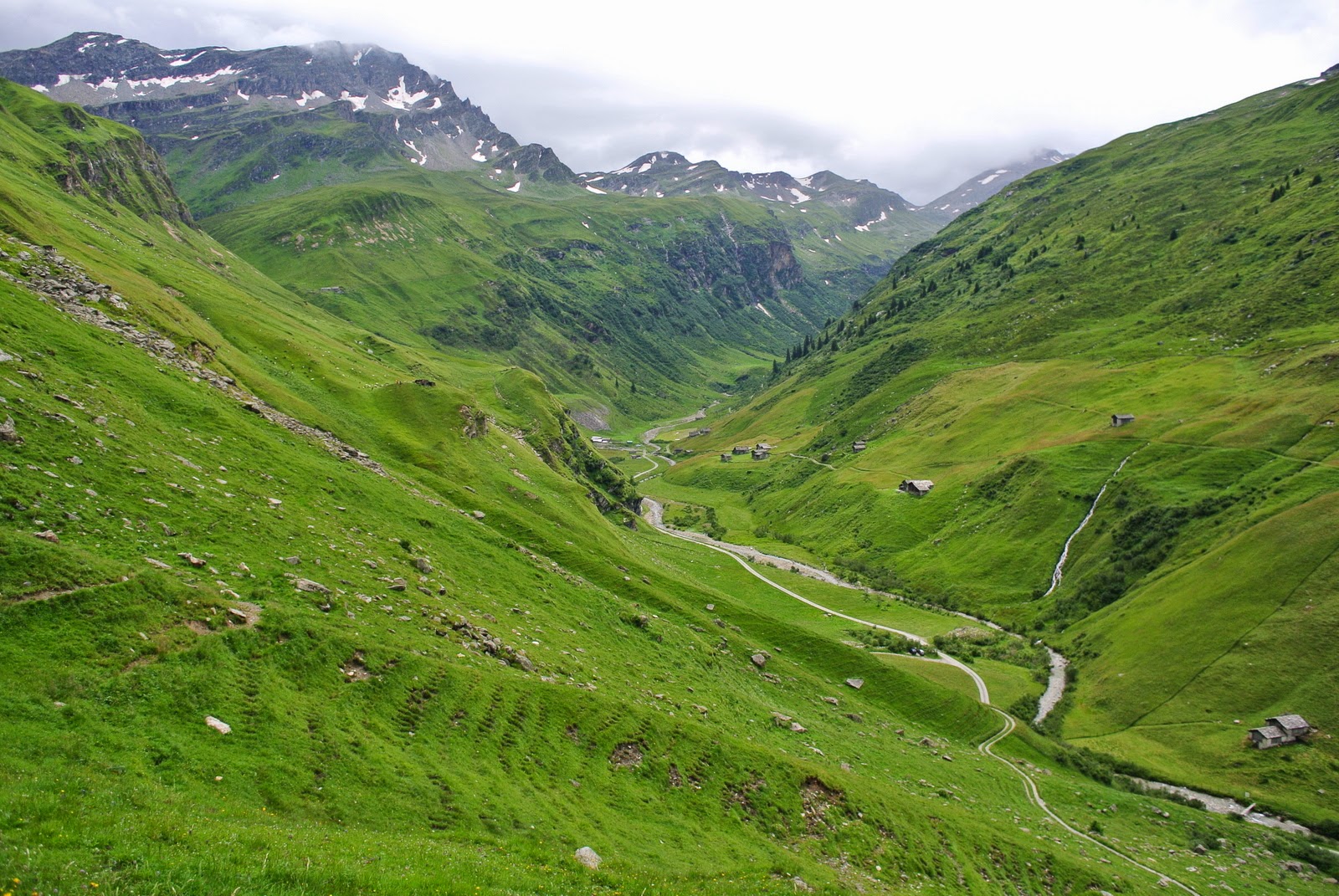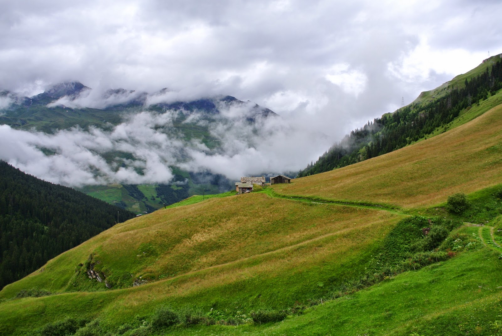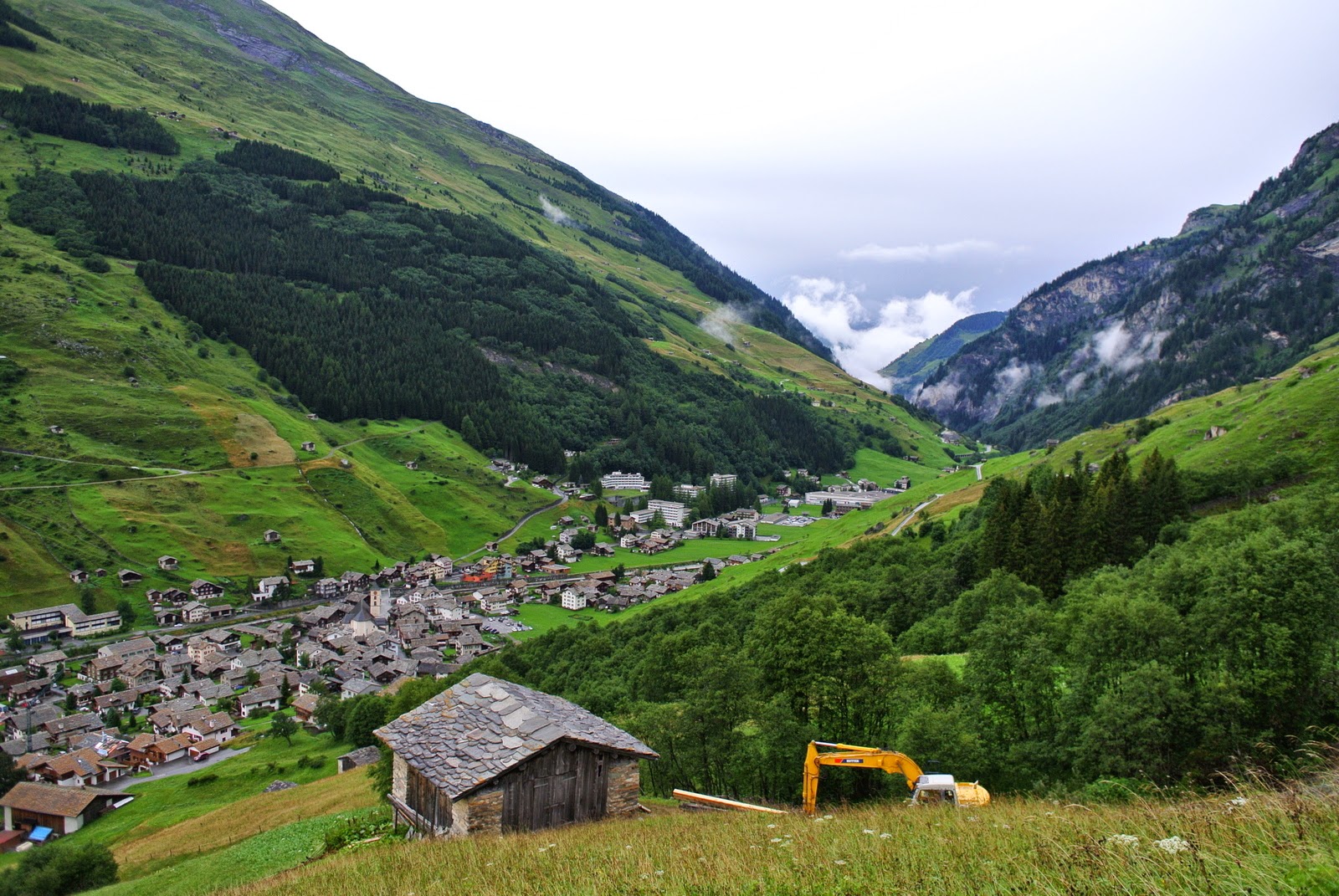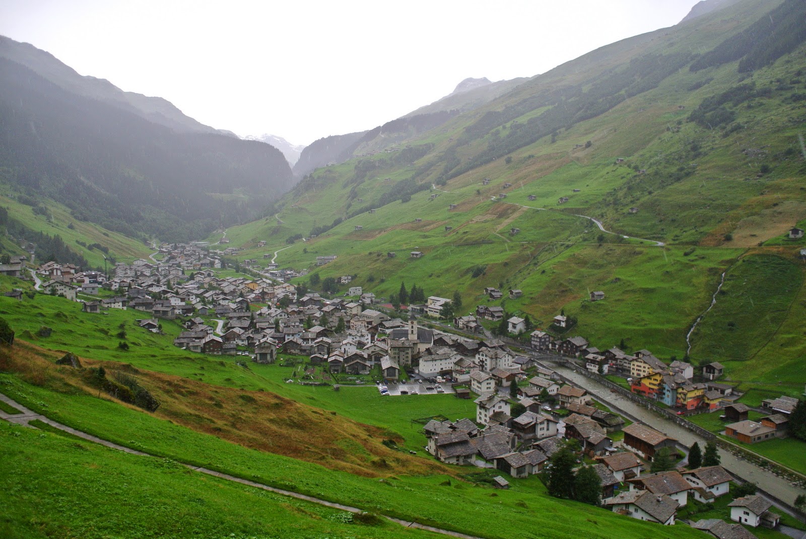 Și bine am făcut – pentru că plouă în continuare, până urc eu acest deal. Traseul mi-a fost recomandat de tanti de la hotel, cică drumul pe care voiam eu, pe la 3 lacuri, e periculos pe ploaie, așa că o iau pe cărări mai normale. Din fericire nu plouă foarte tare, așa că mă pot opri din loc în loc pentru a imortaliza pe peliculă peisajul satului cum stă el în fundul văii; pe măsură ce urc parcă e tot mai frumos, așa că ajung la multe poze doar cu asta.