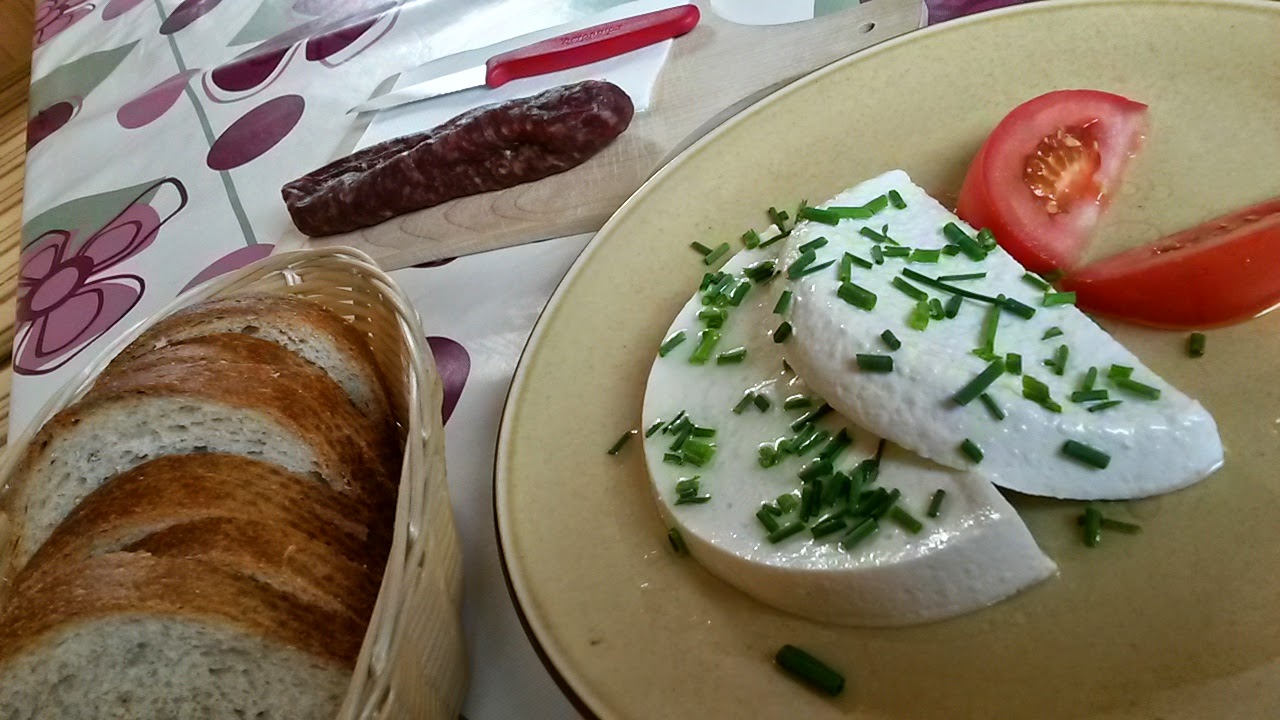 Intru – o cameră mică, o masă simplă cu niște oameni așezați. Meniul e scurt și cuprinzător – aleg brânză de capră cu salsiz, salamul local. De-li-cios.