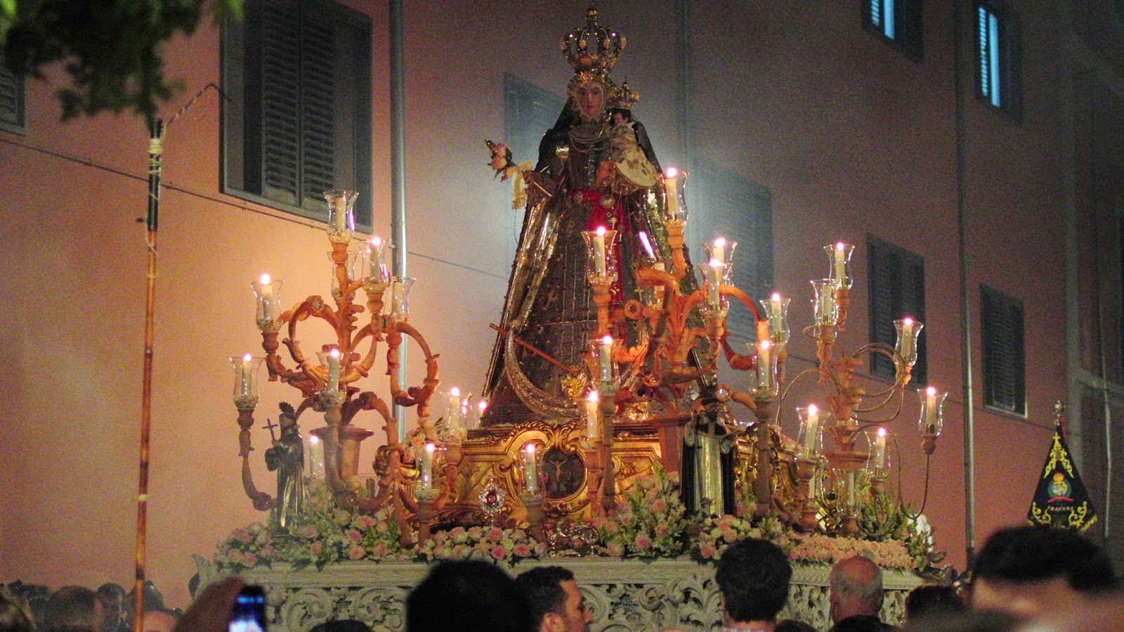Întreb o tanti de la marginea drumului despre ce e vorba, zice că e procesiunea Sfintei Fecioare A Rozariului (?), sărbătoare unde un fel de vecinătăți ale bisericii defilează. Apare și statuia, obiectul principal al pelerinajului.