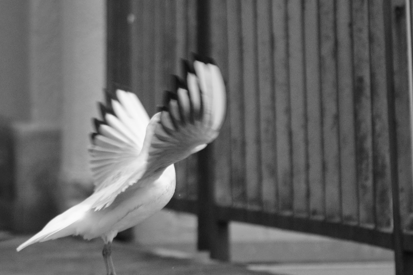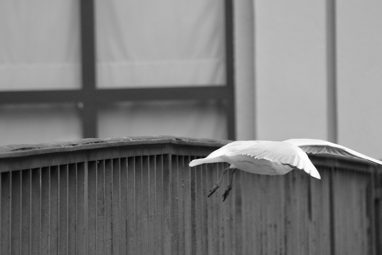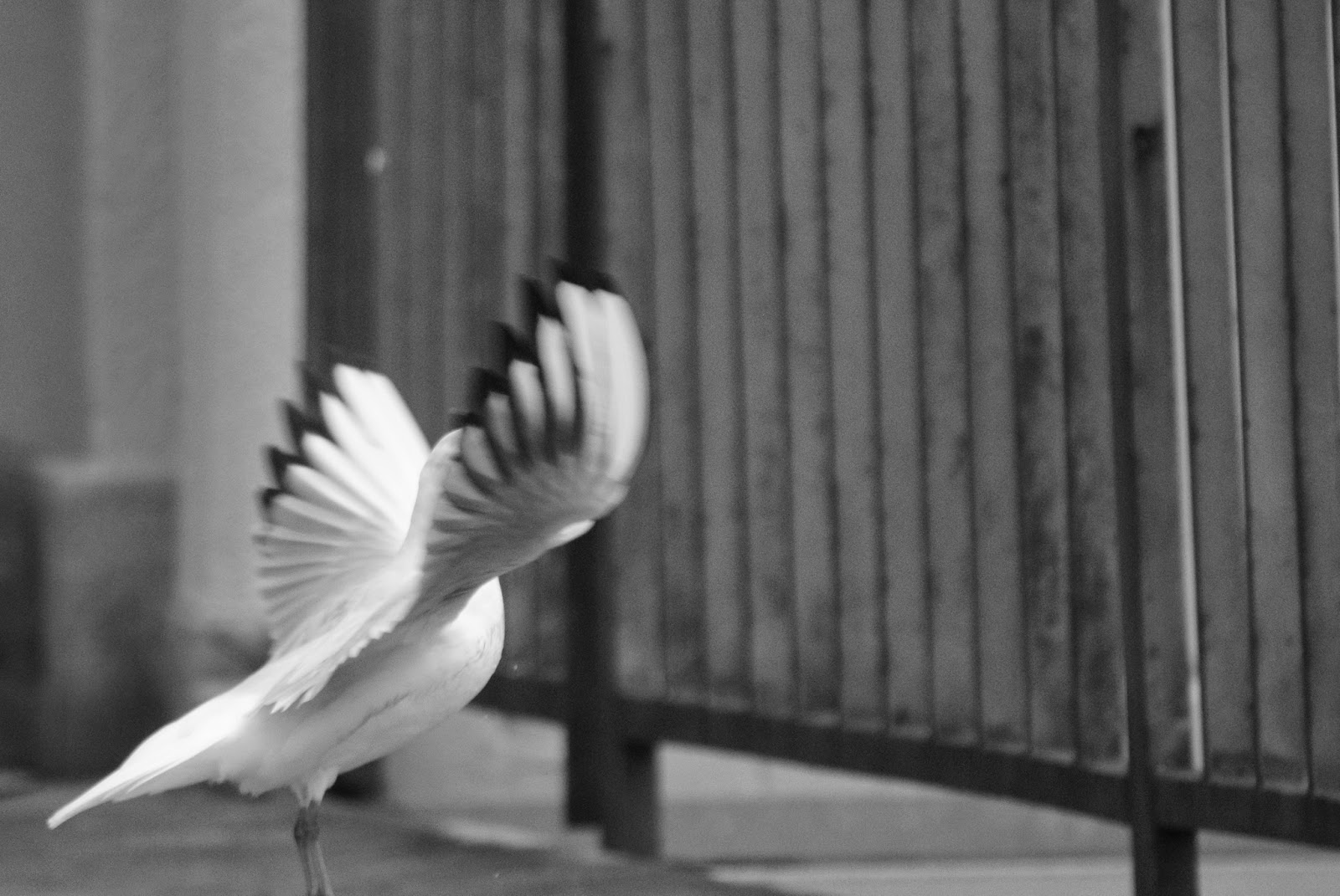 Ajung iar la podul ăsta, dau să mă întorc, când – tocmai se așează un pescăruș pe balustradă. Oo, ia să-ți fac o poză, numașa. Da, iese bine alb-negru. O șterg – n-am ce face cu ea, îmi trebuie vibrație. Hop, stai că-și ia zborul, repede-repede… mda, nu l-am prins tocmai bine, nu e destul de reverberator, așa în planare.