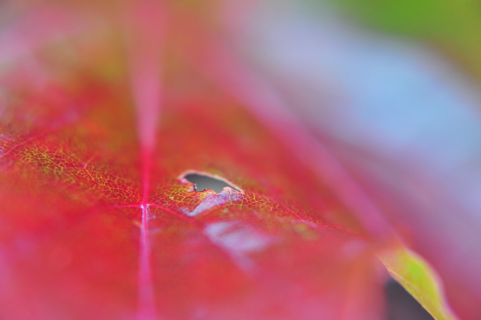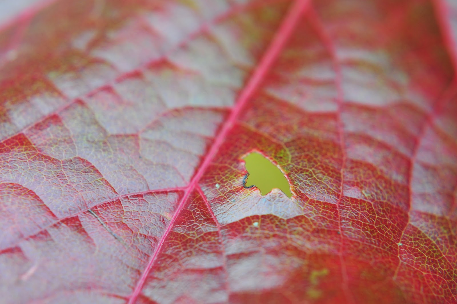 Bun! Cred c-am rezolvat șvungul. La apă cu noi. Dar în drum spre apă îmi atrag atenția frunzele colorate ale unei plante cățărătoare. În mod normal m-aș opri să fac niște poze colorate… dar azi nu suntem în mod normal. Dar mai știi? Mă uit așa, și văd o frunză roșie, cu vârful retezat. Parcă-i simte lipsa… ”lipsă”. Dor. Sehnsucht. Ar merge ca metaforă, cam forțată, dar… eventual ar mai fi un sens, și dorul de vară. Scot D700le, poza asta merge colorată. În timp ce-o scot, văd altă frunză, cu o bucată mică lipsă, în mijloc. Parcă arată mai bine. Ia s-o văd.