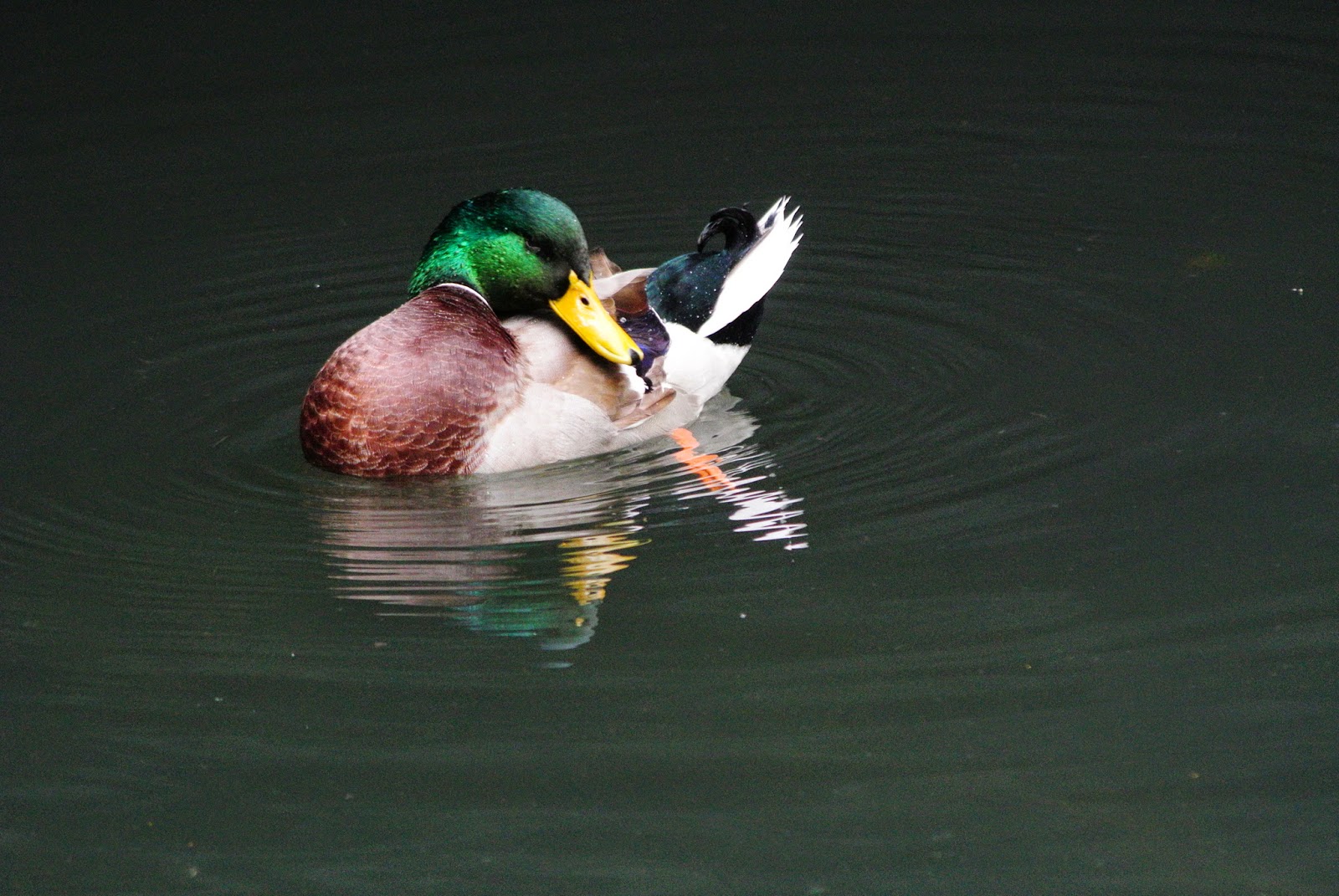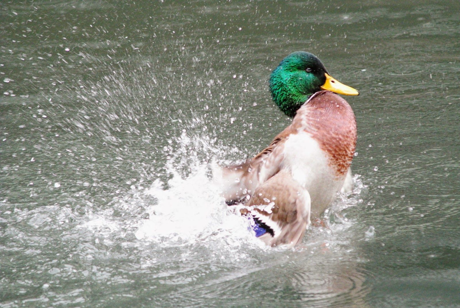 Uff. nu pre convingător. Dar trebuie să ne mișcăm. Las frunzele și cobor în sfârșit la apă – aș vrea să mai încerc o variantă la reverberație, poate iese mai bine. Văd o rață făcându-și toaleta, o urmăresc cu zoom-ul. Și poza asta merge colorată.