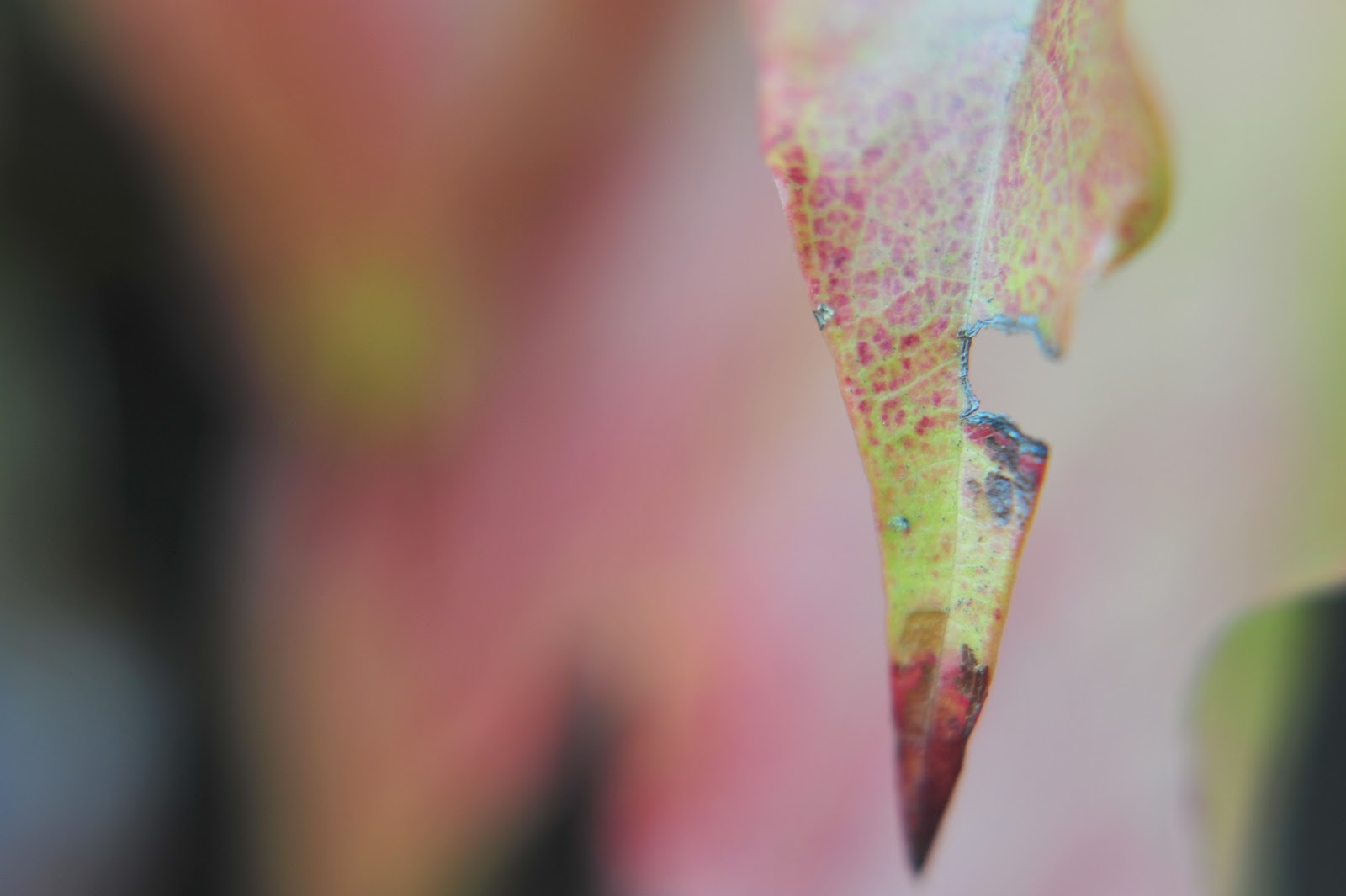 Mda, contrastul e mai bun, dar reflectă mai mult. Să-i pun și filtrul polarizor? Pun, parcă e mai bine. Sau să iau alte frunze cu părți lipsă?