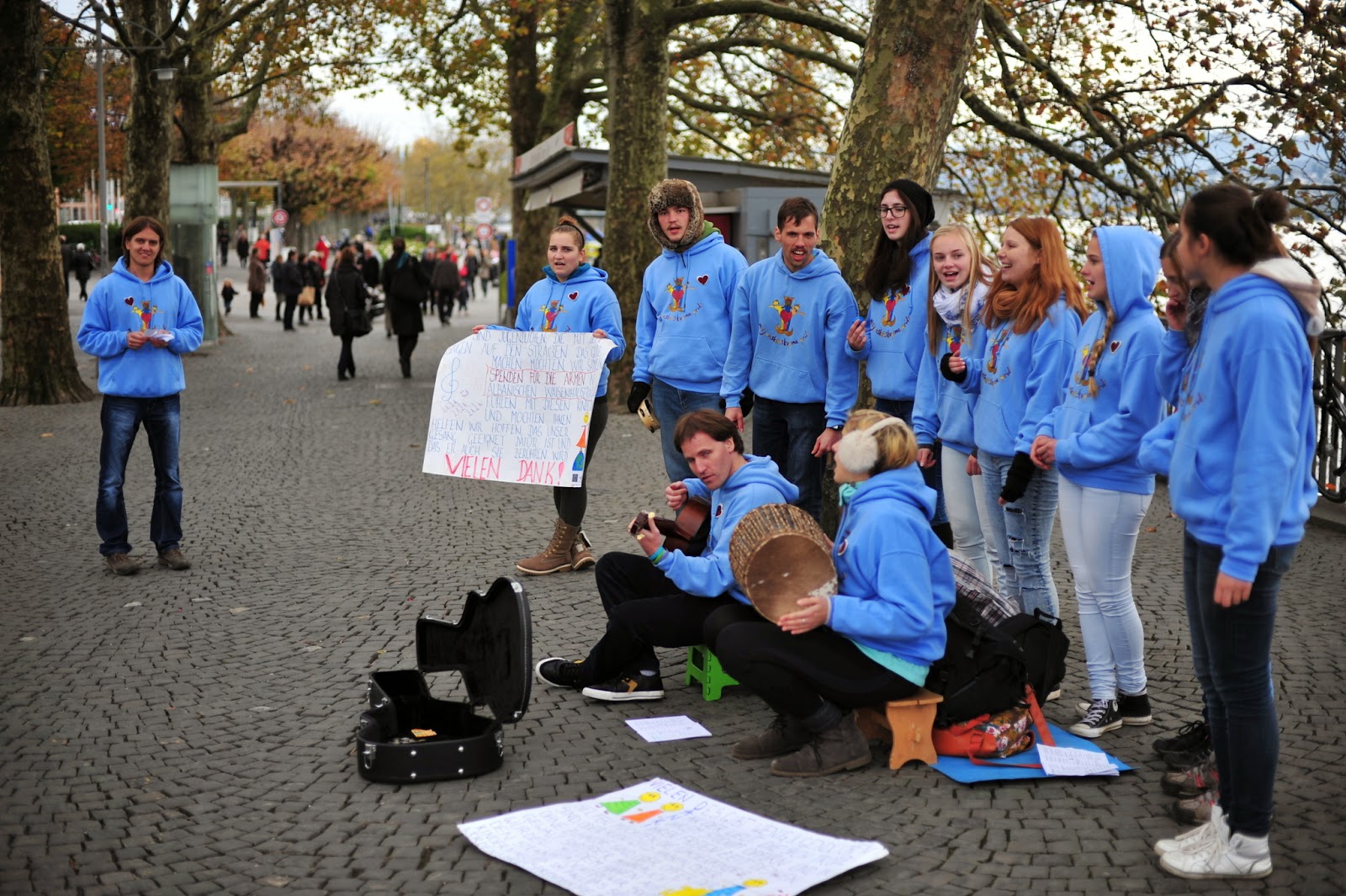 Mai slab decât bavarezul, zic, așa că merg imediat mai departe spre lac, pentru pescăruși. Dar chiar înainte de lac – ce-mi văd ochii? O formație de tineri care tocmai își pregătesc instrumentele. Sunt însoțiți de un călugăr în manta maro, care împarte fluturași. Au o ghitară și o tobă – ajunge pentru o orchestră simfonică? Metaforic, ajunge. La ghitară îmi sclipesc imediat ochii – ultimul acord…